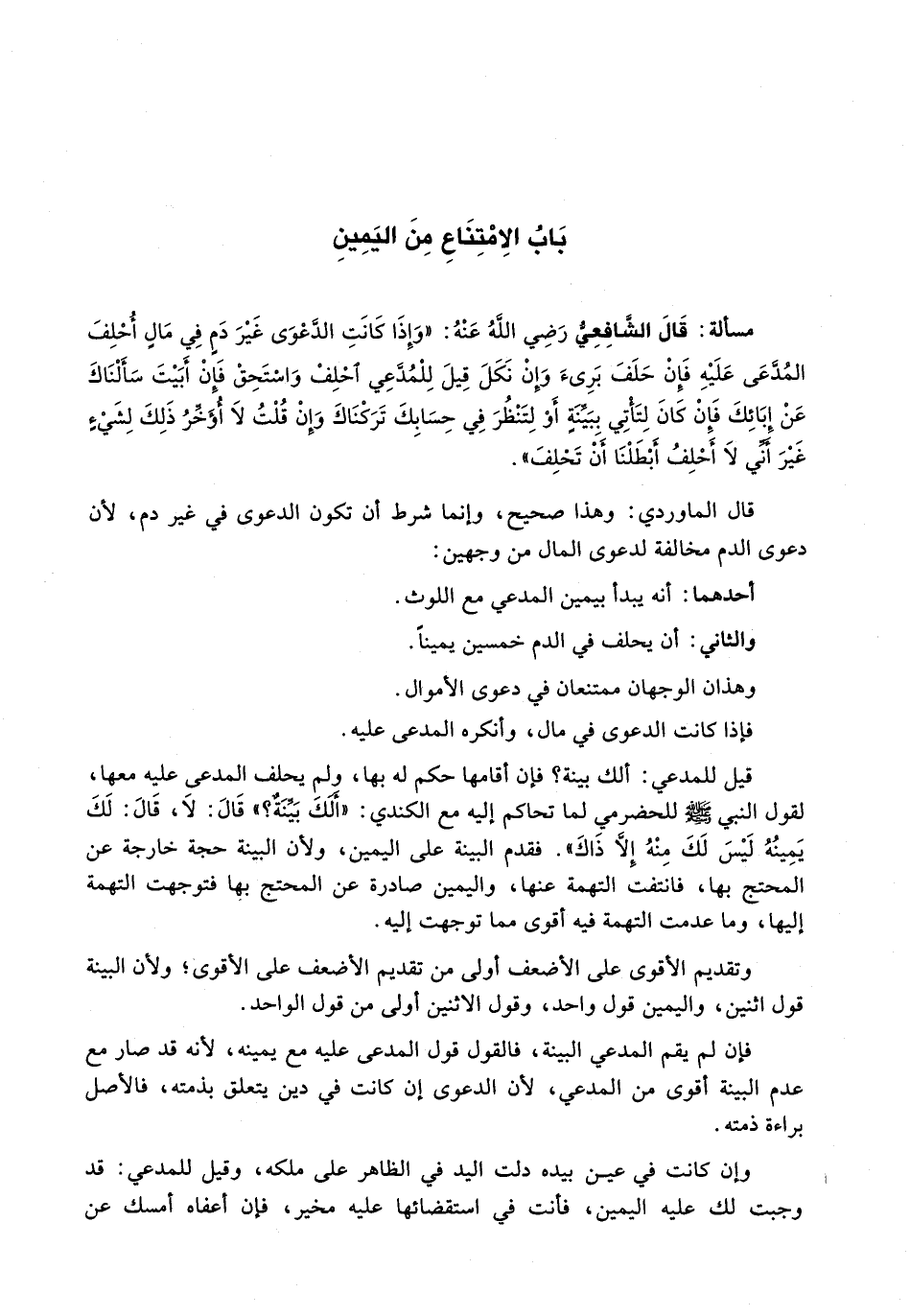 : قال الشافعي رضي الله عنه: " وَإِذَا كَانَتِ الدَّعْوَى غَيْرَ دَمٍ فِي مَالٍ أحلف المدعى عليه فإن حلف برىء وَإِنْ نَكَلَ قِيلَ لِلْمُدَّعِي احْلِفْ وَاسْتَحِقَّ فَإِنْ أَبَيْتَ سَأَلْنَاكَ عَنْ إِبَائِكَ فَإِنْ كَانَ لِتَأْتِيَ بِبَيِّنَةٍ أَوْ لِتَنْظُرَ فِي حِسَابِكَ تَرَكْنَاكَ وَإِنْ قُلْتَ لَا أُؤَخِّرُ ذَلِكَ لِشَيْءٍ غَيْرَ أَنَّى لَا أَحْلِفُ أَبْطَلْنَا أَنْ تَحْلِفَ ".
