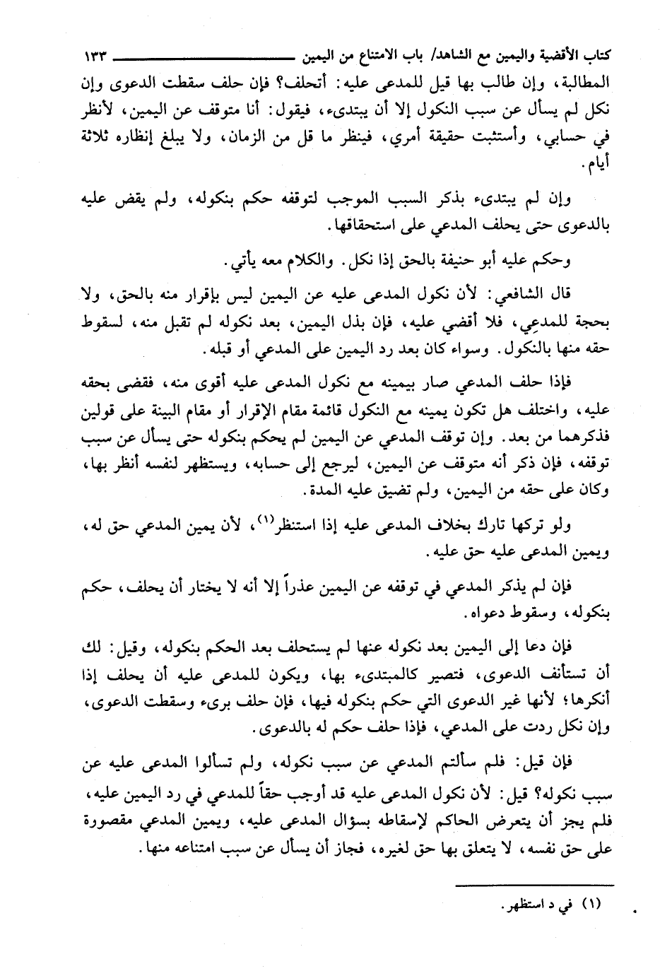الْمُطَالَبَةِ، وَإِنْ طَالَبَ بِهَا قِيلَ لِلْمُدَّعَى عَلَيْهِ: أَتَحْلِفُ؟ فَإِنْ حَلَفَ سَقَطَتِ الدَّعْوَى وَإِنْ نَكَلَ لَمْ يُسْأَلْ عَنْ سَبَبِ النُّكُولِ إِلَّا أَنْ يبتدىء، فَيَقُولَ: أَنَا مُتَوَقِّفٌ عَنِ الْيَمِينِ، لِأَنْظُرَ فِي حِسَابِي، وَأَسْتَثْبِتَ حَقِيقَةَ أَمْرِي، فَيُنْظَرَ مَا قَلَّ مِنَ الزَّمَانِ، وَلَا يَبْلُغُ إِنْظَارُهُ ثَلَاثَةَ أَيَّامٍ.