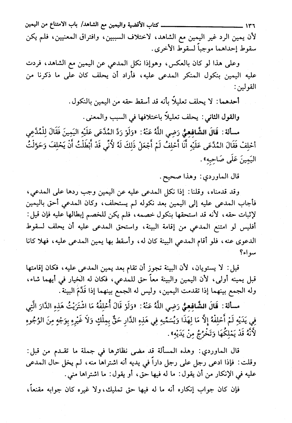 وَقَدْ قَدَّمْنَاهُ، وَقُلْنَا: إِذَا نَكَلَ الْمُدَّعَى عَلَيْهِ عَنِ الْيَمِينِ وَجَبَ رَدُّهَا عَلَى الْمُدَّعِي، فَأَجَابَ الْمُدَّعَى عَلَيْهِ إِلَى الْيَمِينِ بَعْدَ نُكُولِهِ لَمْ يُسْتَحْلَفْ، وَكَانَ الْمُدَّعِي أَحَقَّ بِالْيَمِينِ لِإِثْبَاتِ حَقِّهِ، لِأَنَّهُ قَدِ اسْتَحَقَّهَا بِنُكُولِ خَصْمِهِ، فَلَمْ يَكُنْ لِلْخَصْمِ إِبْطَالُهَا عَلَيْهِ فَإِنْ قِيلَ: أَفَلَيْسَ لَوِ امْتَنَعَ الْمُدَّعِي مِنْ إِقَامَةِ الْبَيِّنَةِ، وَاسْتَحَقَّ الْمُدَّعَى عَلَيْهِ أَنْ يَحْلِفَ لِسُقُوطِ الدَّعْوَى عَنْهُ، فَلَوْ أَقَامَ الْمُدَّعِي الْبَيِّنَةَ كَانَ لَهُ، وَأَسْقَطَ بِهَا يَمِينَ الْمُدَّعَى عَلَيْهِ، فَهَلَّا كَانَا سَوَاءً؟