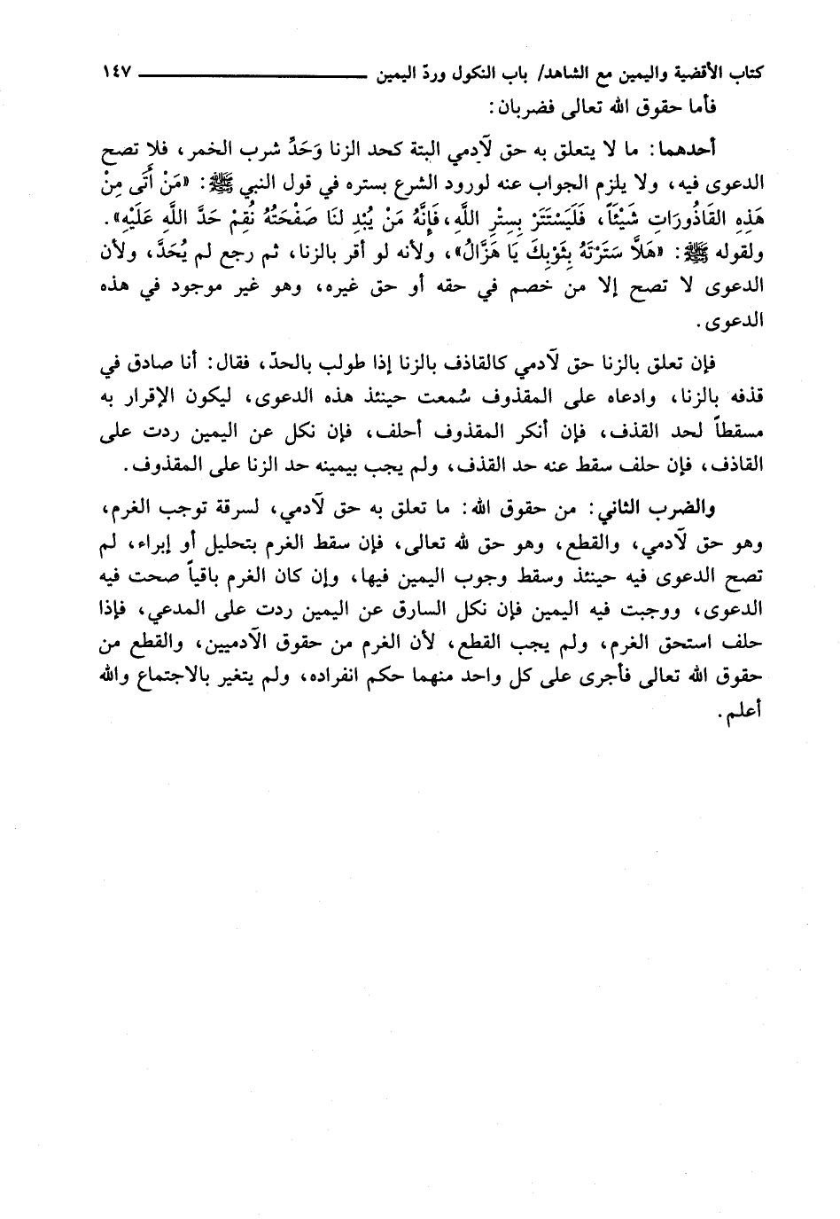 أَحَدُهُمَا: مَا لَا يَتَعَلَّقُ بِهِ حَقٌّ لِآدَمِيٍّ الْبَتَّةَ كَحَدِّ الزِّنَا وَحَدِّ شُرْبِ الْخَمْرِ، فَلَا تَصِحُّ الدَّعْوَى فِيهِ، وَلَا يَلْزَمُ الْجَوَابُ عَنْهُ لِوُرُودِ الشَّرْعِ بِسَتْرِهِ فِي قَوْلِ النَّبِيِّ - صَلَّى اللَّهُ عَلَيْهِ وَسَلَّم َ -: " مَنْ أَتَى مِنْ هَذِهِ الْقَاذُورَاتِ شَيْئًا، فَلْيَسْتَتِرْ بِسِتْرِ اللَّهِ، فَإِنَّهُ مَنْ يُبْدِ لَنَا صَفْحَتَهُ نُقِمْ حَدَّ اللَّهِ عَلَيْهِ ". وَلِقَوْلِهِ - صَلَّى اللَّهُ عَلَيْهِ وَسَلَّم َ -: " هَلَّا سَتَرْتَهُ بِثَوْبِكَ يَا هَزَّالُ "، وَلِأَنَّهُ لَوْ أَقَرَّ بِالزِّنَا، ثُمَّ رَجَعَ لَمْ يُحَدَّ، وَلِأَنَّ الدَّعْوَى لَا تَصِحُّ إِلَّا مِنْ خَصْمٍ فِي حَقِّهِ أَوْ حَقِّ غَيْرِهِ، وَهُوَ غَيْرُ مَوْجُودٍ فِي هَذِهِ الدَّعْوَى.