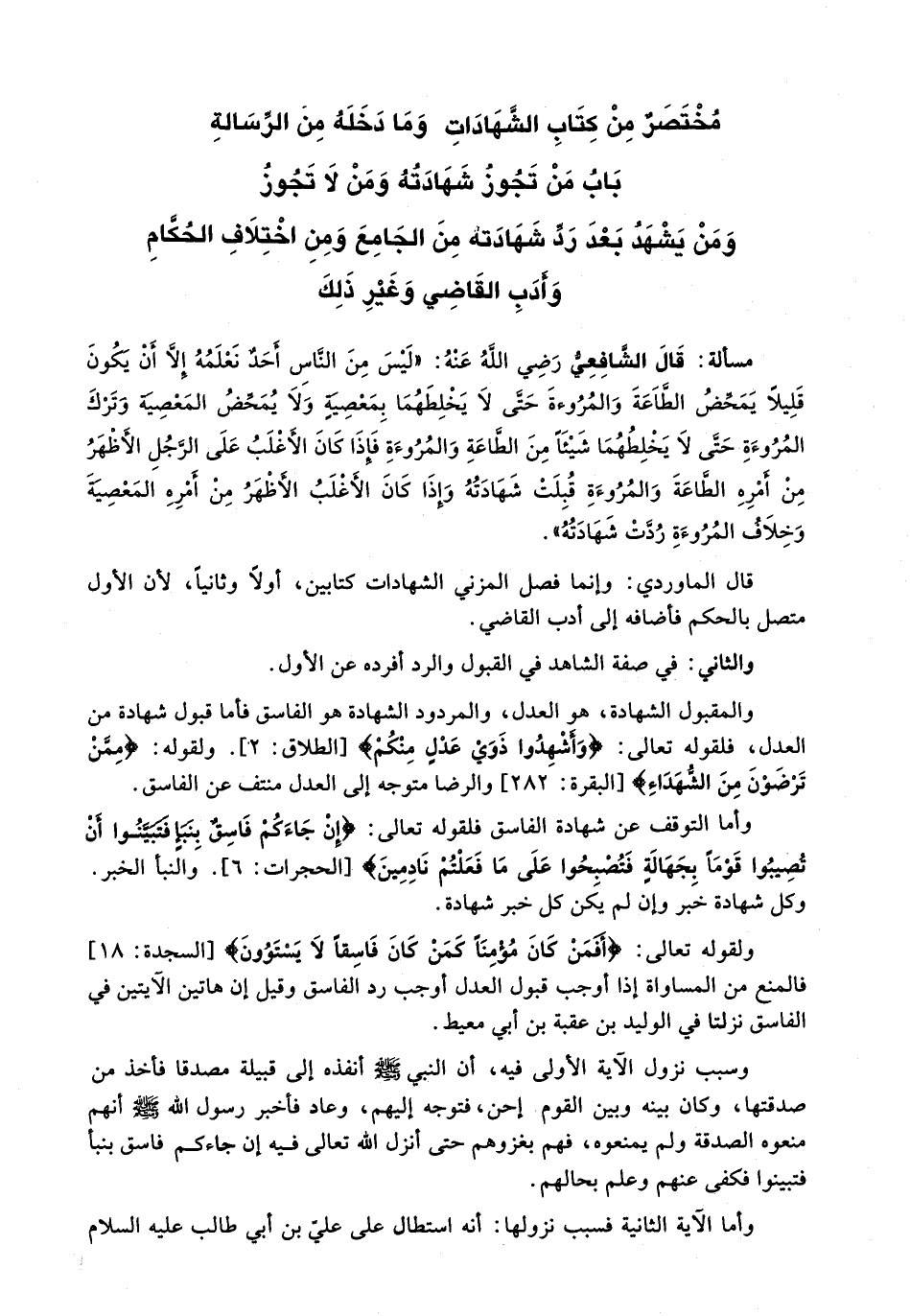 : قال الشافعي رضي الله عنه: " لَيْسَ مِنَ النَّاسِ أَحَدٌ نَعْلَمُهُ إِلَّا أَنْ يَكُونَ قَلِيلًا يُمَحِّضُ الطَّاعَةَ وَالْمُرُوءَةَ حَتَّى لَا يَخْلِطَهُمَا بِمَعْصِيَةٍ وَلَا يُمَحِّضُ الْمَعْصِيَةَ وَتَرْكَ الْمُرُوءَةِ حَتَّى لَا يَخْلِطَهُمَا شَيْئًا مِنَ الطَّاعَةِ وَالْمُرُوءَةِ فَإِذَا كَانَ الْأَغْلَبُ عَلَى الرَّجُلِ الْأَظْهَرُ مِنْ أَمْرِهِ الطَّاعَةَ وَالْمُرُوءَةَ قُبِلَتْ شَهَادَتُهُ وَإِذَا كَانَ الْأَغْلَبُ الْأَظْهَرُ مِنْ أَمْرِهِ الْمَعْصِيَةَ وَخِلَافَ الْمُرُوءَةِ رُدَّتْ شَهَادَتُهُ ".