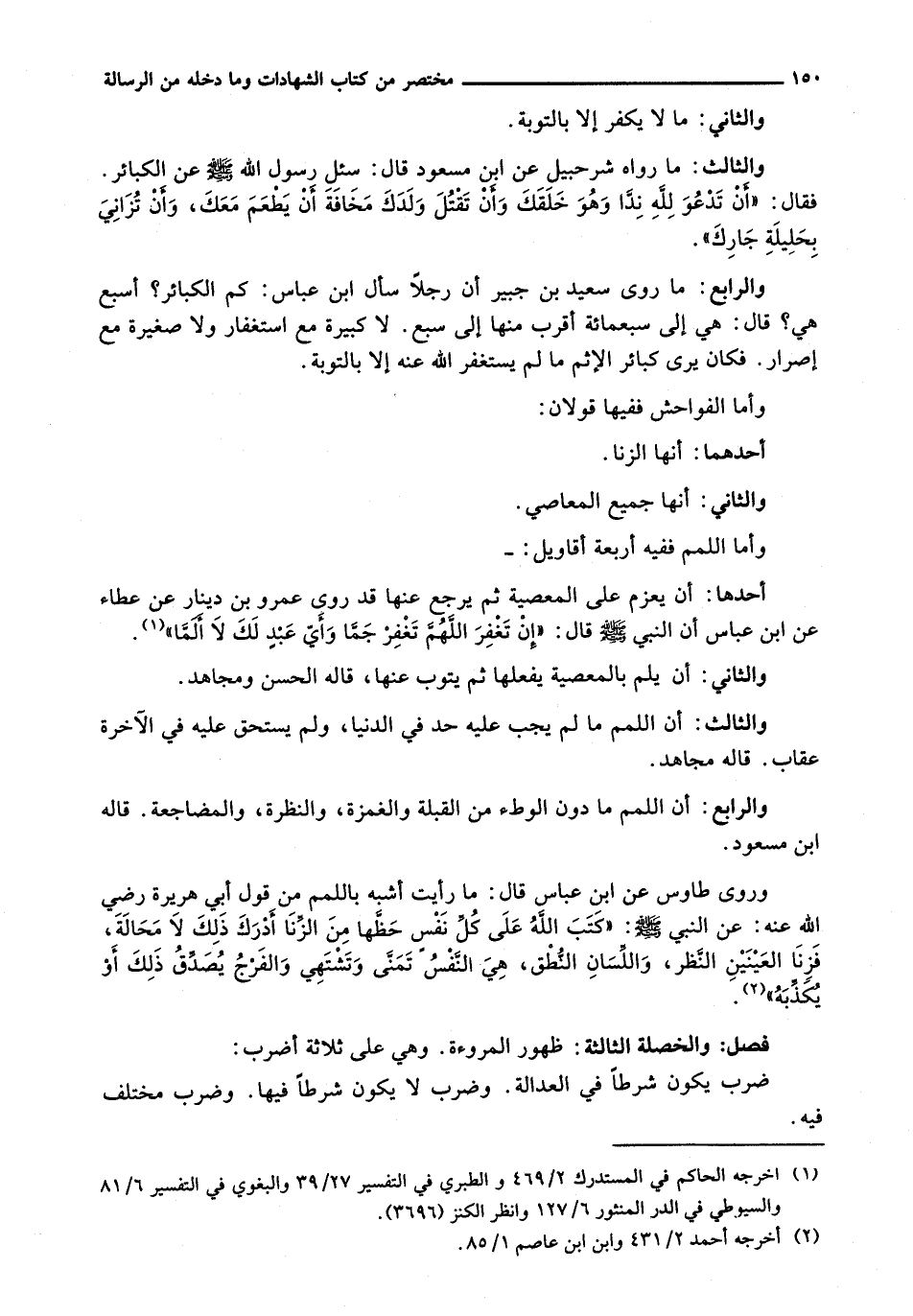 وَرَوَى طَاوُسٌ عَنِ ابْنِ عَبَّاسٍ قَالَ: مَا رَأَيْتُ أَشْبَهَ بِاللَّمَمِ مِنْ قَوْلِ أَبِي هُرَيْرَةَ رَضِيَ اللَّهُ عَنْهُ: عَنِ النَّبِيِّ - صَلَّى اللَّهُ عَلَيْهِ وَسَلَّم َ -: " كَتَبَ اللَّهُ عَلَى كُلِّ نَفْسٍ حَظَّهَا مِنَ الزِّنَا أَدْرَكَ ذَلِكَ لَا مَحَالَةَ، فَزِنَا الْعَيْنَيْنِ النَّظَرُ، وَاللِّسَانِ النُّطْقُ، هِيَ النَّفْسُ تَمَنَّى وَتَشْتَهِي وَالْفَرْجُ يُصَدِّقُ ذَلِكَ أَوْ يُكَذِّبُهُ ".