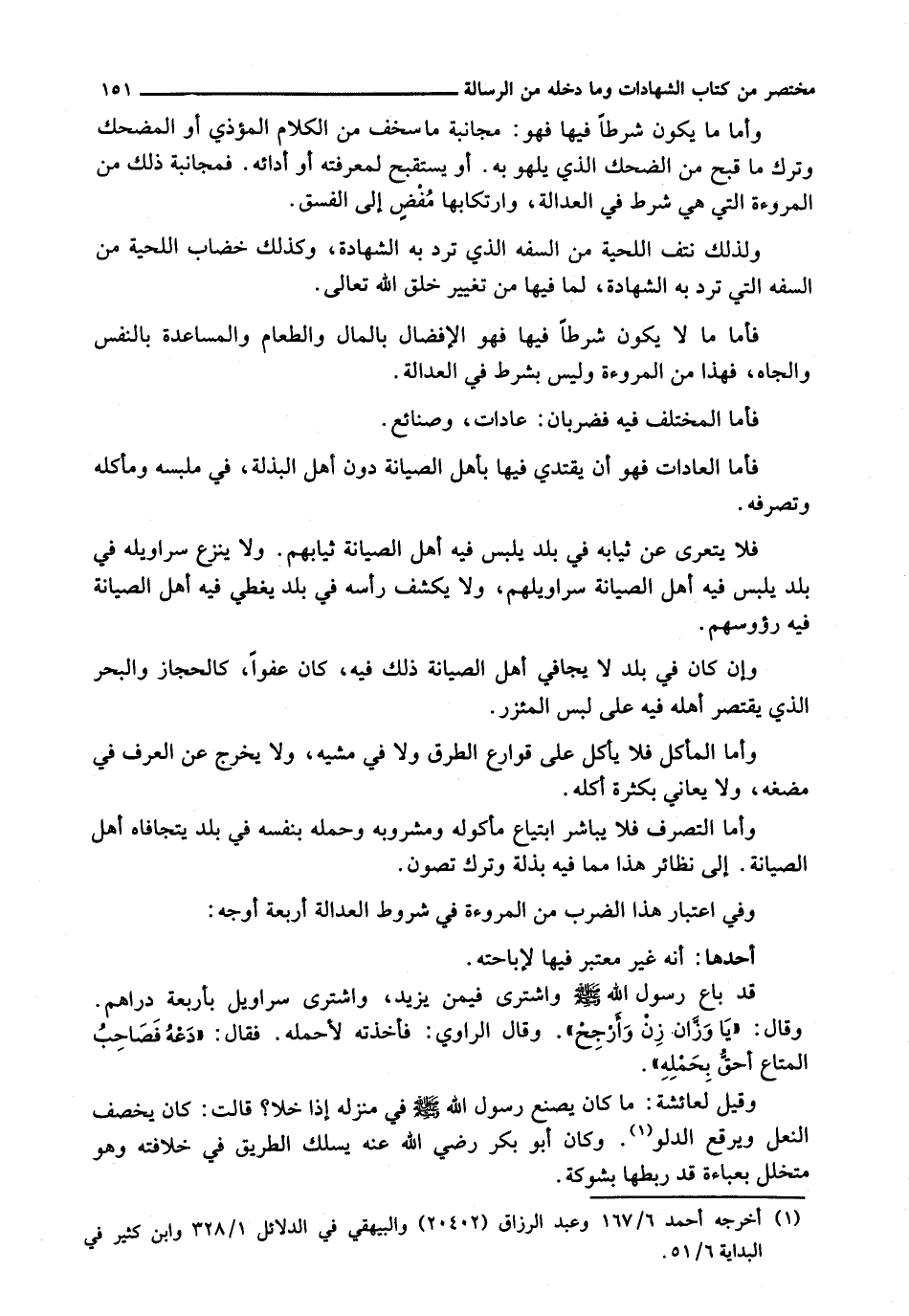 وَأَمَّا مَا يَكُونُ شَرْطًا فِيهَا فَهُوَ: مُجَانَبَةُ مَا سَخُفَ مِنَ الْكَلَامِ الْمُؤْذِي أَوِ الْمُضْحِكِ وَتَرْكُ مَا قَبُحَ مِنَ الضَّحِكِ الَّذِي يَلْهُو بِهِ. أَوْ يُسْتَقْبَحُ لِمَعْرِفَتِهِ أَوْ أَدَائِهِ. فَمُجَانَبَةُ ذَلِكَ مِنَ الْمُرُوءَةِ الَّتِي هِيَ شَرْطٌ فِي الْعَدَالَةِ، وَارْتِكَابُهَا مُفْضٍ إِلَى الْفِسْقِ.