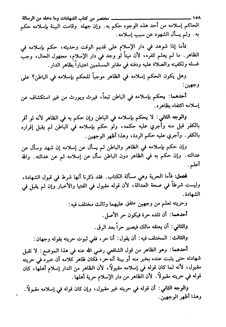 أَحَدُهُمَا: وَهُوَ الظَّاهِرُ مِنْ قَوْلِ الشَّافِعِيِّ رَضِيَ اللَّهُ عَنْهُ فِي هَذَا الْمَوْضِعِ: لَا تُقْبَلُ شَهَادَتُهُ حَتَّى يَثْبُتَ عِنْدَهُ بِخَبَرٍ مِنْهُ أَوْ بَيِّنَةٍ أَنَّهُ حُرٌّ، فَكَانَ ظَاهِرُ كَلَامِهِ أَنَّ خَبَرَهُ فِي حُرِّيَّتِهِ مَقْبُولٌ، لِأَنَّهُ لَمَّا كَانَ قَوْلُهُ فِي إِسْلَامِهِ مَقْبُولًا، لِأَنَّ الظَّاهِرَ مِنَ الدَّارِ إِسْلَامُ أَهْلِهَا، كَانَ قَوْلُهُ فِي حُرِّيَّتِهِ مَقْبُولًا. لِأَنَّ الظَّاهِرَ مِنْ دَارِ الْإِسْلَامِ حُرِّيَّةُ أَهْلِهَا.