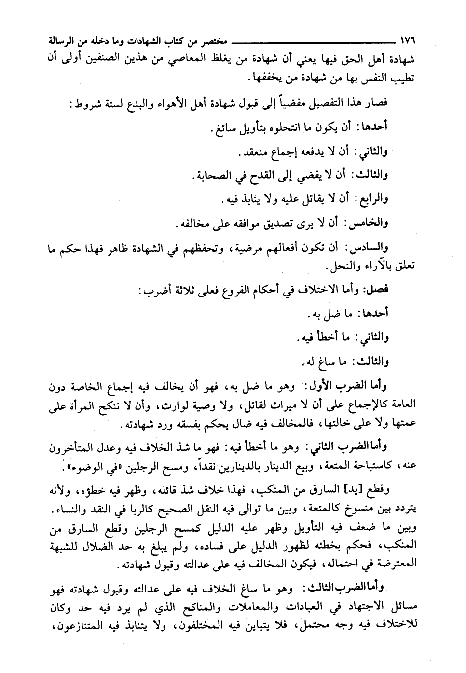وَقَطْعِ [يَدِ] السَّارِقِ مِنَ الْمَنْكِبِ، فَهَذَا خِلَافٌ شَذَّ قَائِلُهُ، وَظَهَرَ فِيهِ خَطَؤُهُ، وَلِأَنَّهُ يَتَرَدَّدُ بَيْنَ مَنْسُوخٍ كَالْمُتْعَةِ، وَبَيْنَ مَا تَوَالَى فِيهِ النَّقْلُ الصَّحِيحُ كَالرِّبَا فِي النَّقْدِ وَالنِّسَاءِ. وَبَيْنَ مَا ضَعُفَ فِيهِ التَّأْوِيلُ وَظَهَرَ عَلَيْهِ الدَّلِيلُ كَمَسْحِ الرِّجْلَيْنِ وَقَطْعِ السَّارِقِ مِنَ الْمَنْكِبِ، فَحُكِمَ بِخَطَئِهِ لِظُهُورِ الدَّلِيلِ عَلَى فَسَادِهِ، وَلَمْ يَبْلُغْ بِهِ حَدَّ الضَّلَالِ لِلشُّبْهَةِ الْمُعْتَرِضَةِ فِي احْتِمَالِهِ، فَيَكُونُ الْمُخَالِفُ فِيهِ على عدالته وقبول شَهَادَتَهُ.