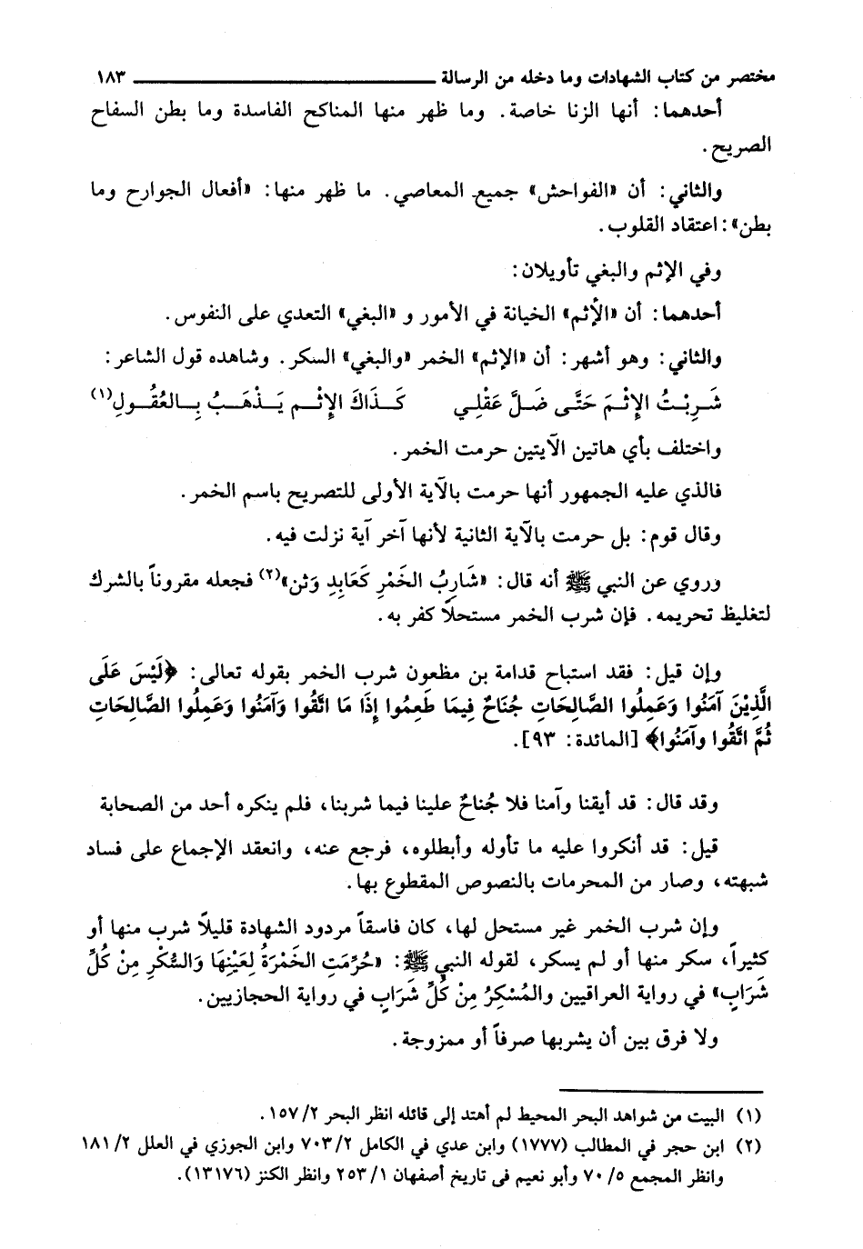 (شَرِبْتُ الْإِثْمَ حَتَّى ضَلَّ عَقْلِي ... كَذَاكَ الْإِثْمُ يَذْهَبُ بِالْعُقُولِ)