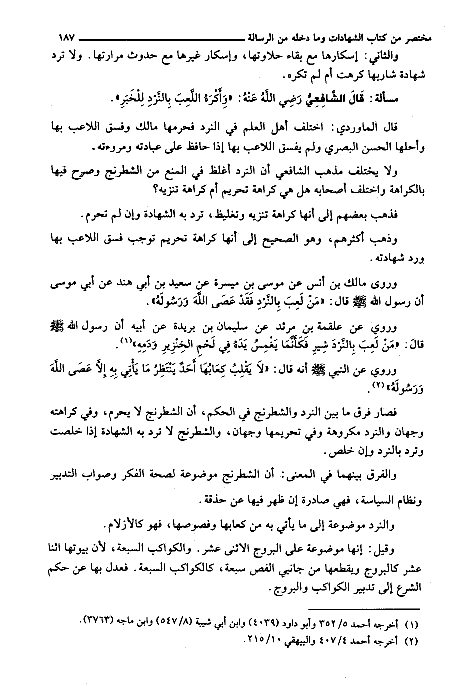 فَصَارَ فَرْقُ مَا بَيْنَ النَّرْدِ وَالشِّطْرَنْجِ فِي الْحُكْمِ، أَنَّ الشَّطْرَنْجَ لَا يُحَرَّمُ، وَفِي كَرَاهَتِهِ وَجْهَانِ وَالنَّرْدُ مَكْرُوهَةٌ وَفِي تَحْرِيمِهَا وَجْهَانِ، وَالشَّطْرَنْجُ لَا تُرَدُّ بِهِ الشَّهَادَةُ إِذَا خَلَصَتْ وَتُرَدُّ بِالنَّرْدِ وَإِنْ خَلَصَ.