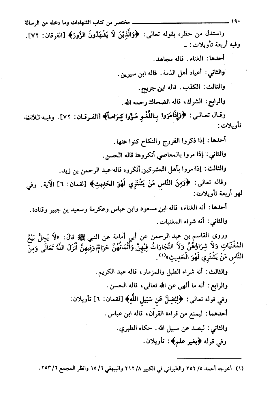 وَاسْتَدَلَّ مَنْ حَظَرَهُ بِقَوْلِهِ تَعَالَى: {وَالَّذِينَ لا يَشْهَدُونَ الزُّورَ} [الفرقان: 72] . وَفِيهِ أَرْبَعَةُ تَأْوِيلَاتٍ: -