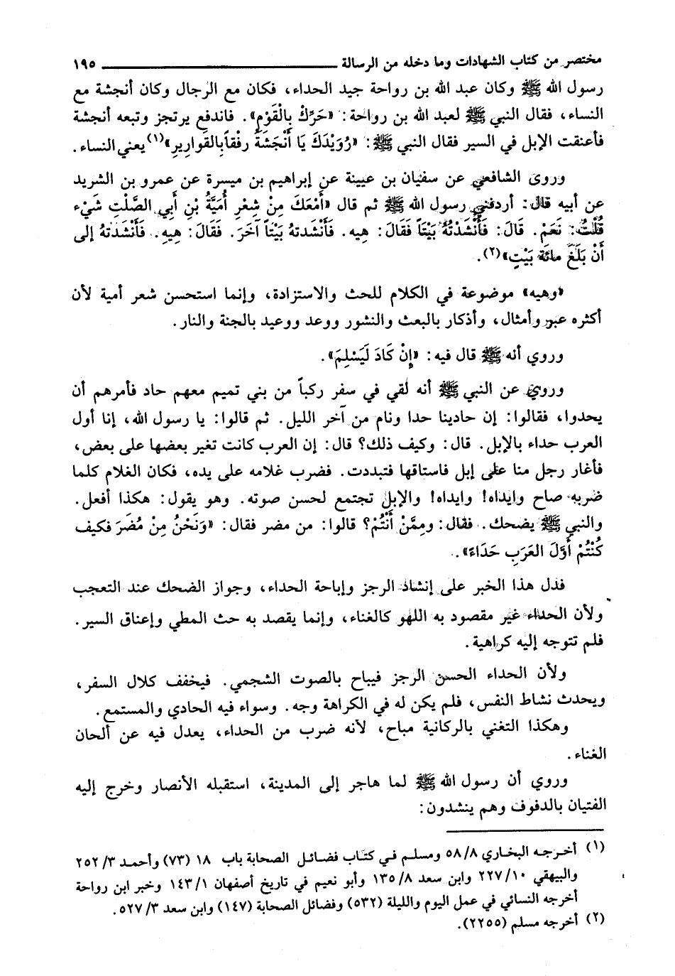رسول الله - صَلَّى اللَّهُ عَلَيْهِ وَسَلَّم َ - وَكَانَ عَبْدُ اللَّهِ بْنُ رَوَاحَةَ جَيِّدَ الْحُدَاءِ، فَكَانَ مَعَ الرِّجَالِ وَكَانَ أَنْجَشَةُ مَعَ النِّسَاءِ، فقال النبي - صَلَّى اللَّهُ عَلَيْهِ وَسَلَّم َ - لِعَبْدِ اللَّهِ بْنِ رَوَاحَةَ: " حَرِّكْ بِالْقَوْمِ ". فَانْدَفَعَ يَرْتَجِزُ وَتَبِعَهُ أَنْجَشَةُ فَأَعْنَقَتِ الْإِبِلُ فِي السَّيْرِ فقال النبي - صَلَّى اللَّهُ عَلَيْهِ وَسَلَّم َ -: " رُويْدَكَ يَا أَنْجَشَةُ رِفْقًا بِالْقَوَارِيرِ " يَعْنِي النِّسَاءَ.