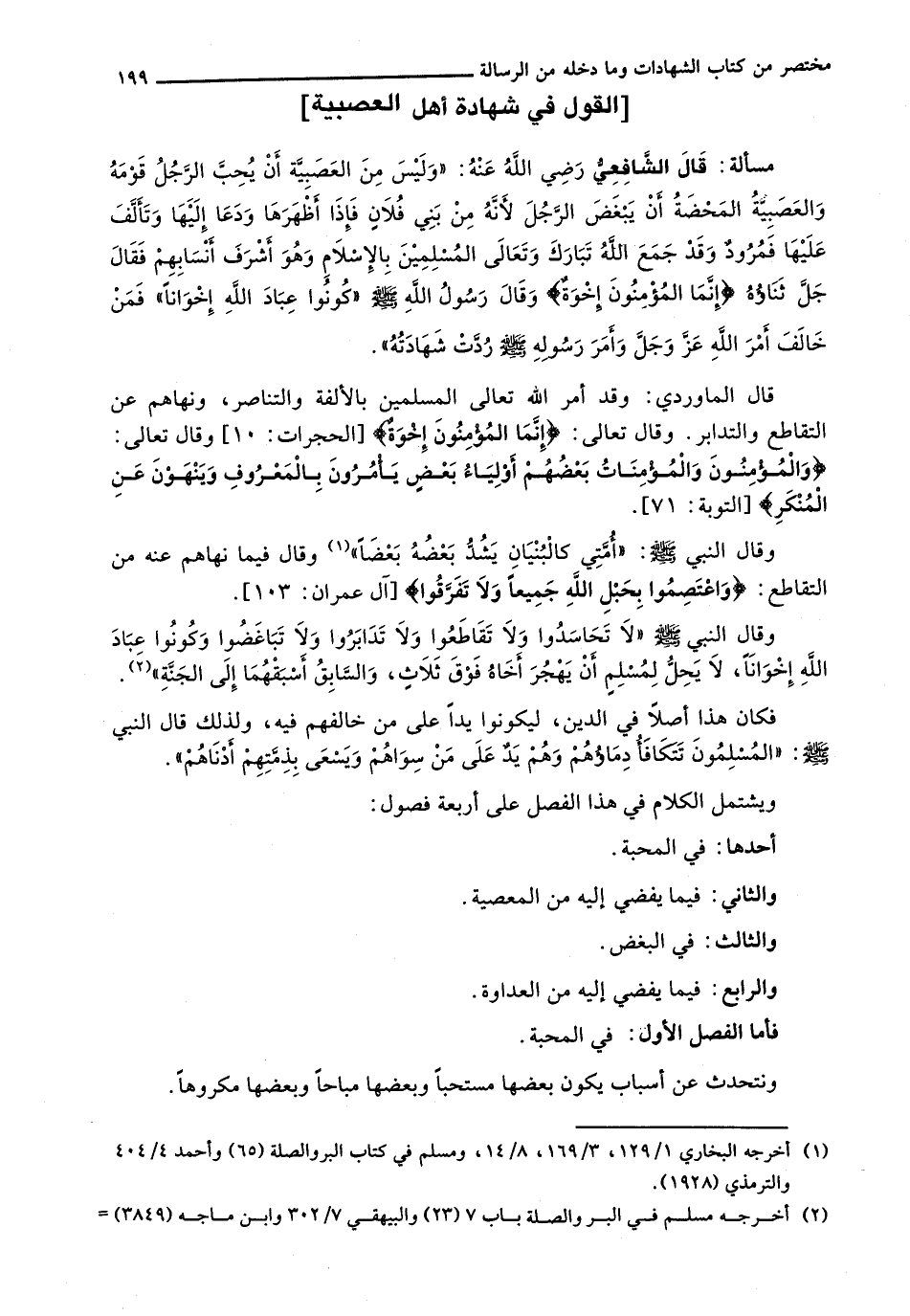 : قَالَ الشافعي رضي الله عنه: " وَلَيْسَ مِنَ الْعَصَبِيَّةِ أَنْ يُحِبَّ الرَّجُلُ قَوْمَهُ وَالْعَصَبِيَّةُ الْمَحْضَةُ أَنْ يُبْغَضَ الرَّجُلُ لِأَنَّهُ مِنْ بَنِي فُلَانٍ فَإِذَا أَظْهَرَهَا وَدَعَا إِلَيْهَا وَتَأَلَّفَ عليها فمرود وقد جمع الله تباك وَتَعَالَى الْمُسْلِمِينَ بِالْإِسْلَامِ وَهُوَ أَشْرَفُ أَنْسَابِهِمْ فَقَالَ جل ثناؤه {إنما المؤمنون إخوة} وَقَالَ رَسُولُ اللَّهِ - صَلَّى اللَّهُ عَلَيْهِ وَسَلَّم َ - " كُونَوَا عِبَادَ اللَّهِ إِخْوَانًا " فَمَنْ خَالَفَ أَمْرَ اللَّهِ عَزَّ وَجَلَّ وَأَمْرَ رَسُولِهِ - صَلَّى اللَّهُ عَلَيْهِ وَسَلَّم َ - رُدَّتْ شَهَادَتُهُ ".