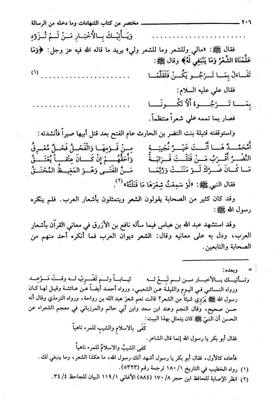 وَقَدْ كَانَ كَثِيرٌ مِنَ الصَّحَابَةِ يَقُولُونَ الشِّعْرَ وَيَتَمَثَّلُونَ بِأَشْعَارِ الْعَرَبِ. فَلَمْ يُنْكِرْهُ رَسُولُ اللَّهِ - صَلَّى اللَّهُ عَلَيْهِ وَسَلَّم َ -: