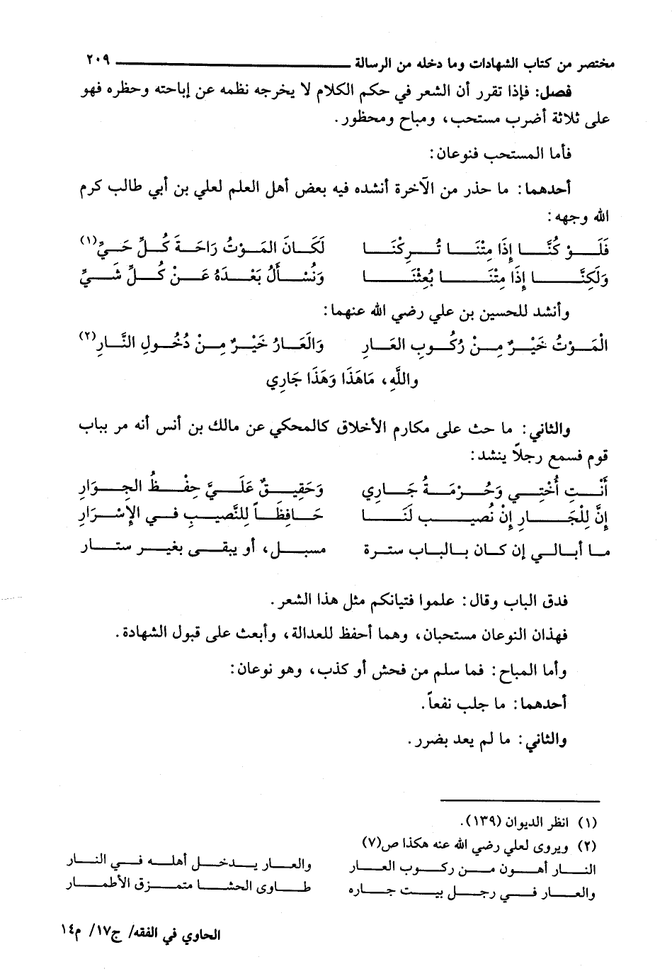 : فَإِذَا تَقَرَّرَ أَنَّ الشِّعْرَ فِي حُكْمِ الْكَلَامِ لَا يُخْرِجُهُ نَظْمُهُ عَنْ إِبَاحَتِهِ وَحَظْرِهِ فَهُوَ عَلَى ثَلَاثَةِ أَضْرُبٍ مُسْتَحَبٌّ، وَمُبَاحٌ وَمَحْظُورٌ.