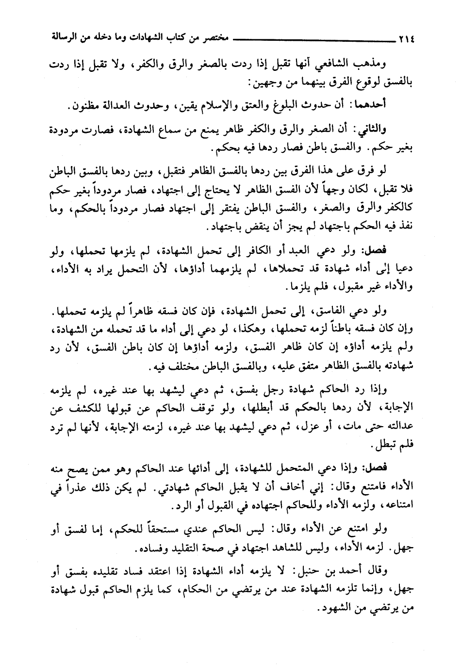 وَالثَّانِي: أَنَّ الصِّغَرَ وَالرِّقَّ وَالْكُفْرَ ظَاهِرٌ يُمْنَعُ مِنْ سَمَاعِ الشَّهَادَةِ، فَصَارَتْ مَرْدُودَةً بِغَيْرِ حُكْمٍ. وَالْفِسْقُ بَاطِنٌ فَصَارَ رَدُّهَا فِيهِ بِحُكْمِ.