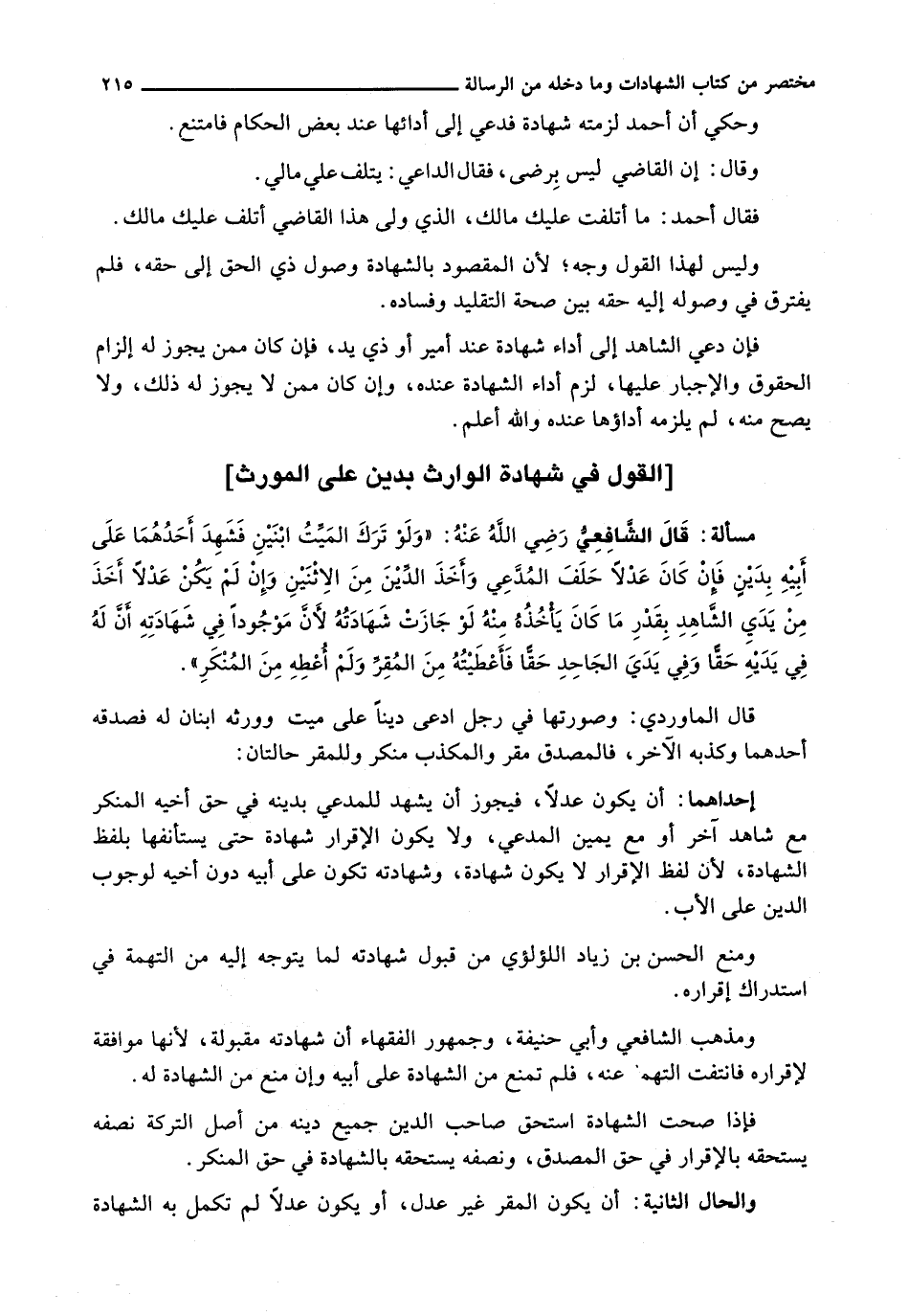 : قال الشافعي رضي الله عنه: " وَلَوْ تَرَكَ الْمَيِّتُ ابْنَيْنِ فَشَهِدَ أَحَدُهُمَا عَلَى أَبِيهِ بِدَيْنٍ فَإِنْ كَانَ عَدْلًا حَلَفَ الْمُدَّعِي وَأَخَذَ الدَّيْنَ مِنْ الِاثْنَيْنِ وَإِنْ لَمْ يَكُنْ عَدْلًا أَخَذَ مِنْ يَدَيِ الشَّاهِدِ بِقَدْرِ مَا كان يأخذه منه لو جازت شهادته لأن موجودا فِي شَهَادَتِهِ أَنَ لَهُ فِي يَدَيْهِ حَقَّا وَفِي يَدَيِ الْجَاحِدِ حَقًّا فَأَعْطَيْتُهُ مِنَ الْمُقِرِّ وَلَمْ أُعْطِهِ مِنَ الْمُنْكِرِ ".