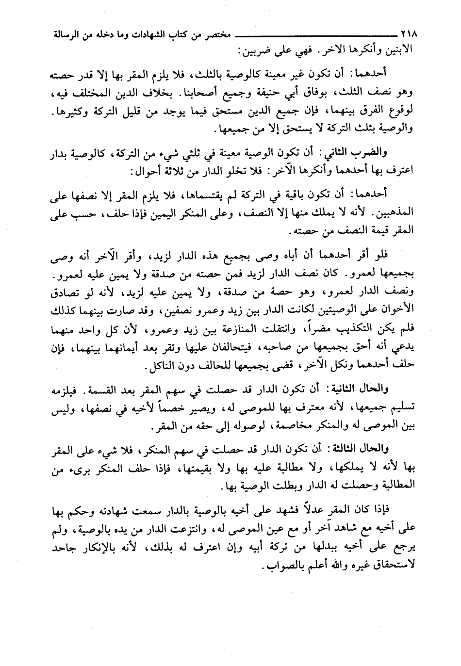 فَإِذَا كَانَ الْمُقِرُّ عَدْلًا فَشَهِدَ عَلَى أَخِيهِ بِالْوَصِيَّةِ بِالدَّارِ سُمِعَتْ شَهَادَتُهُ وَحُكِمَ بِهَا عَلَى أَخِيهِ مَعَ شَاهِدٍ آخَرَ أَوْ مَعَ عَيْنِ الْمُوصَى لَهُ، وَانْتُزِعَتِ الدَّارُ مِنْ يَدِهِ بِالْوَصِيَّةِ، وَلَمْ يَرْجِعْ عَلَى أَخِيهِ بِبَدَلِهَا مِنْ تَرِكَةِ أَبِيهِ وَإِنِ اعْتَرَفَ لَهُ بِذَلِكَ، لِأَنَّهُ بِالْإِنْكَارِ جَاحِدٌ لِاسْتِحْقَاقِ غَيْرِهِ وَاللَّهُ أَعْلَمُ بِالصَّوَابِ.