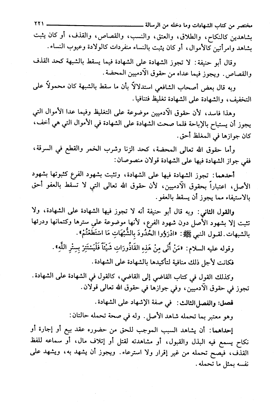 وَالْقَوْلُ الثَّانِي: وَبِهِ قَالَ أَبُو حَنِيفَةَ إِنَّهُ لَا تَجُوزُ فِيهَا الشَّهَادَةُ عَلَى الشَّهَادَةِ، وَلَا تَثْبُتُ إِلَّا بِشُهُودِ الْأَصْلِ دُونَ شُهُودِ الْفَرْعِ، لِأَنَّهَا مَوْضُوعَةٌ عَلَى سِتْرِهَا وَكِتْمَانِهَا وَدَرْئِهَا بِالشُّبَهَاتِ. لِقَوْلِ النَّبِيِّ - صَلَّى اللَّهُ عَلَيْهِ وَسَلَّم َ -: " ادرؤوا الْحُدُودَ بِالشُّبُهَاتِ مَا اسْتَطَعْتُمْ ".
