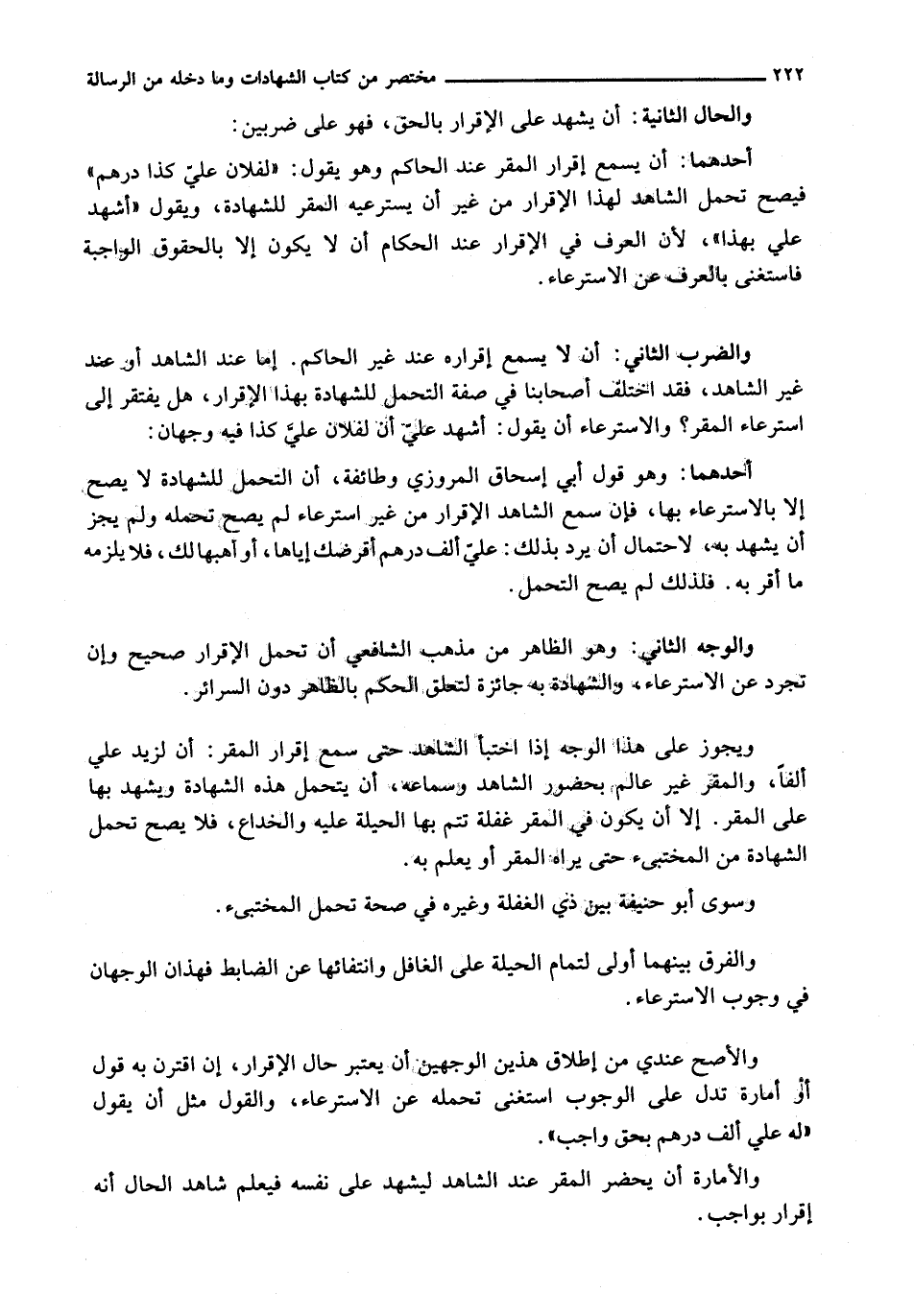 وَالْوَجْهُ الثَّانِي: وَهُوَ الظَّاهِرُ مِنْ مَذْهَبِ الشَّافِعِيِّ أَنَّ تَحَمُّلَ الْإِقْرَارِ صَحِيحٌ وَإِنْ تَجَرَّدَ عَنْ الِاسْتِرْعَاءِ، وَالشَّهَادَةُ بِهِ جَائِزَةٌ لِتَعَلُّقِ الْحُكْمِ بِالظَّاهِرِ دُونَ السَّرَائِرِ.