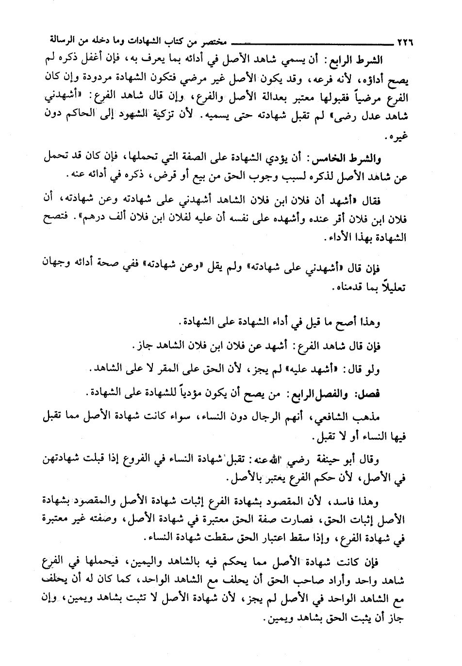الشَّرْطُ الرَّابِعُ: أَنْ يُسَمِّيَ شَاهِدَ الْأَصْلِ فِي أَدَائِهِ بِمَا يُعْرَفُ بِهِ، فَإِنْ أَغْفَلَ ذِكْرَهُ لَمْ يَصِحَّ أَدَاؤُهُ، لِأَنَّهُ فَرْعُهُ، وَقَدْ يَكُونُ الْأَصْلُ غَيْرَ مَرْضِيٍّ فَتَكُونُ الشَّهَادَةُ مَرْدُودَةٌ وَإِنْ كَانَ الْفَرْعُ مَرْضِيًّا فَقَبُولُهَا مُعْتَبَرٌ بِعَدَالَةِ الْأَصْلِ وَالْفَرْعِ، وَإِنْ قَالَ شَاهِدُ الْفَرْعِ: " أَشْهَدَنِي شَاهِدُ عَدْلٍ رِضًى " لَمْ تُقْبَلْ شَهَادَتُهُ حَتَّى يُسَمِّيَهُ. لِأَنَّ تَزْكِيَةَ الشُّهُودِ إِلَى الْحَاكِمِ دُونَ غَيْرِهِ.