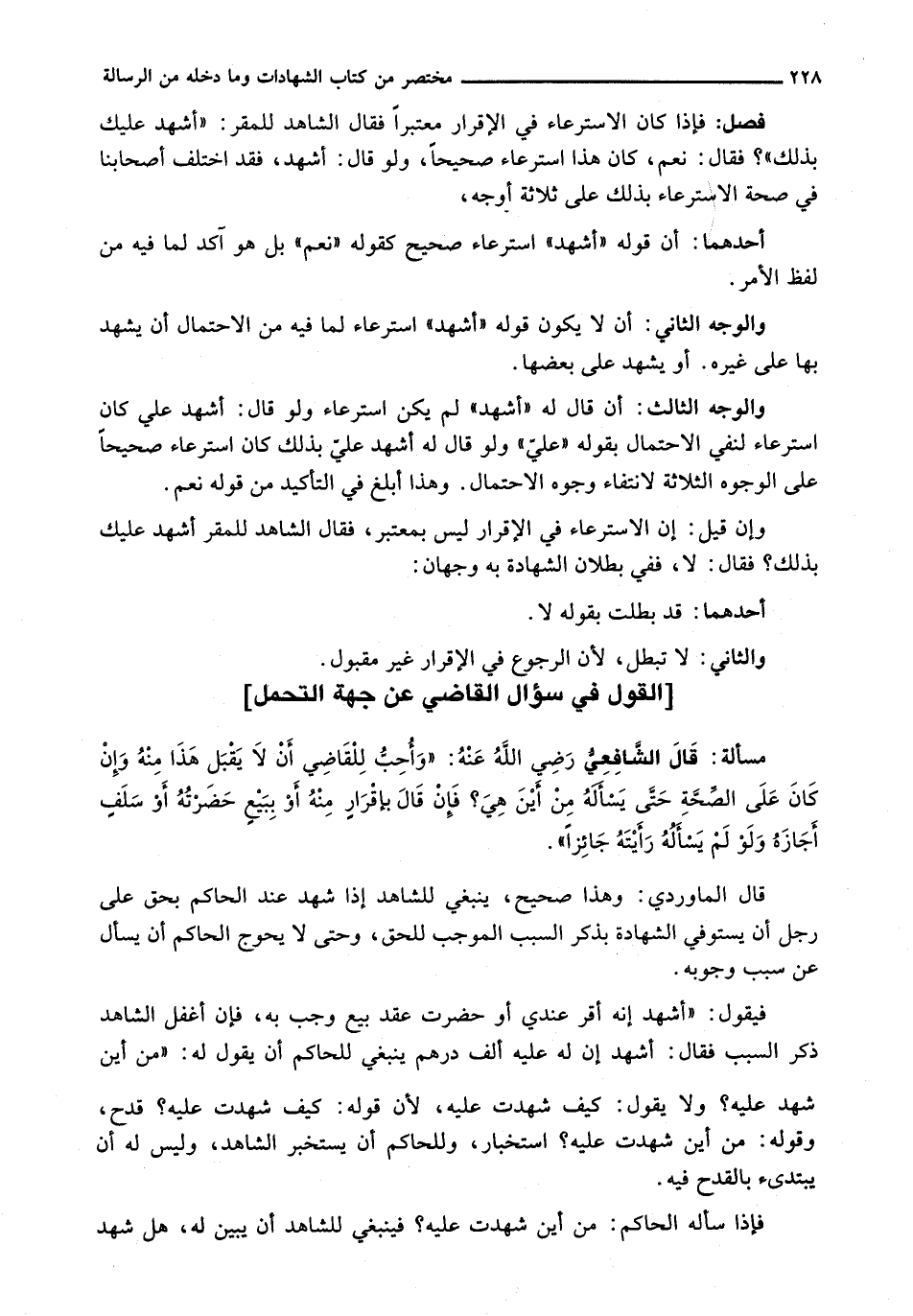 : قال الشافعي رضي الله عنه: " وَأُحِبُّ لِلْقَاضِي أَنْ لَا يَقْبَلَ هَذَا مِنْهُ وَإِنْ كَانَ عَلَى الصِّحَّةِ حَتَّى يَسْأَلَهُ مِنْ أَيْنَ هِيَ؟ فَإِنْ قَالَ بِإِقْرَارٍ مِنْهُ أَوْ بِبَيْعٍ حَضَرْتُهُ أَوْ سَلَفٍ أَجَازَه وَلَوْ لَمْ يَسْأَلْهُ رَأَيْتُهُ جَائِزًا ".