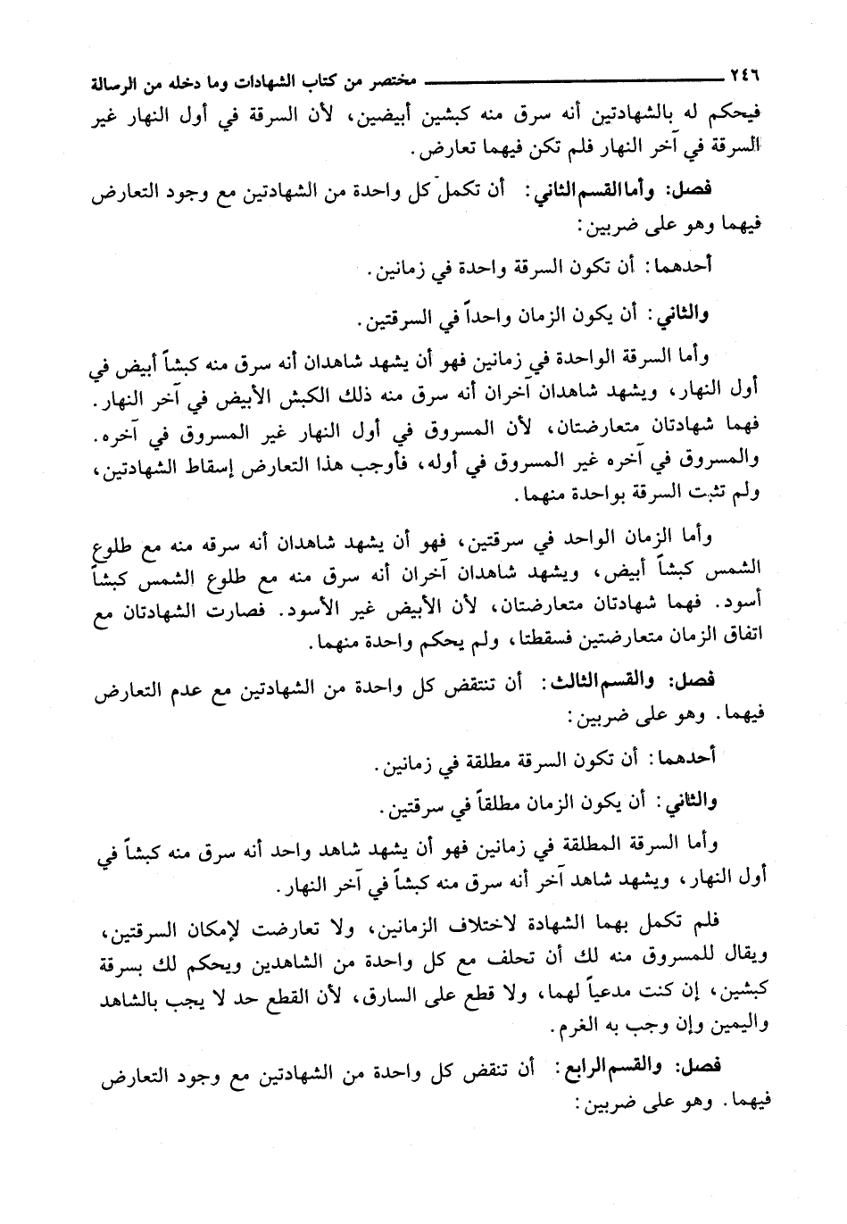 وَأَمَّا السَّرِقَةُ الْوَاحِدَةُ فِي زَمَانَيْنِ فَهُوَ أَنْ يَشْهَدَ شَاهِدَانِ أَنَّهُ سَرَقَ مِنْهُ كَبْشًا أَبْيَضَ فِي أَوَّلِ النَّهَارِ، وَيَشْهَدُ شَاهِدَانِ آخَرَانِ أَنَّهُ سَرَقَ مِنْهُ ذَلِكَ الْكَبْشَ الْأَبْيَضَ فِي آخِرِ النَّهَارِ. فَهُمَا شَهَادَتَانِ مُتَعَارِضَتَانِ، لِأَنَّ الْمَسْرُوقَ فِي أَوَّلِ النَّهَارِ غَيْرُ الْمَسْرُوقِ فِي آخِرِهِ. وَالْمَسْرُوقَ فِي آخِرِهِ غَيْرُ الْمَسْرُوقِ فِي أَوَّلِهِ، فَأَوْجَبَ هَذَا التَّعَارُضُ إِسْقَاطَ الشَّهَادَتَيْنِ، وَلَمْ تَثْبُتِ السَّرِقَةُ بِوَاحِدَةٍ مِنْهُمَا.