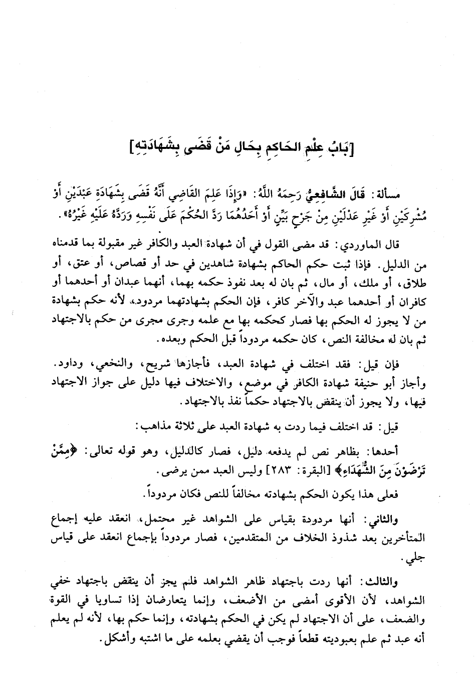 : قَالَ الشَّافِعِيُّ رَحِمَهُ اللَّهُ: " وَإِذَا عَلِمَ الْقَاضِي أَنَّهُ قَضَى بِشَهَادَةِ عَبْدَيْنِ أَوْ مُشْرِكَيْنِ أَوْ غَيْرِ عَدْلَيْنِ مِنْ جَرْحٍ بَيِّنٍ أَوْ أَحَدِهِمَا رَدَّ الْحُكْمَ عَلَى نَفْسِهِ وَرَدَّهُ عَلَيْهِ غَيْرُهُ ".
