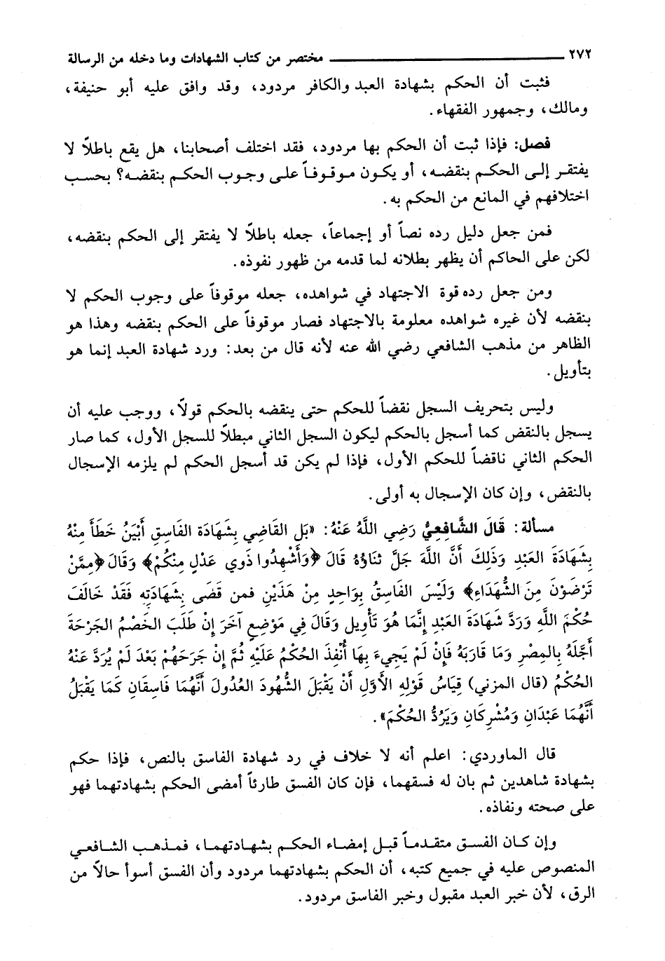 : قال الشافعي رضي الله عنه: " بَلِ الْقَاضِي بِشَهَادَةِ الْفَاسِقِ أَبْيَنُ خَطَأً مِنْهُ بِشَهَادَةِ الْعَبْدِ وَذَلِكَ أَنَ اللَّهَ جَلَّ ثَنَاؤُهُ قال {وأشهدوا ذوي عدل منكم} وقال {ممن ترضون من الشهداء} وَلَيْسَ الْفَاسِقُ بِوَاحِدٍ مِنْ هَذَيْنِ فَمَنْ قَضَى بِشَهَادَتِهِ فَقَدْ خَالَفَ حُكْمَ اللَّهِ وَرَدُّ شَهَادَةِ العبد إنما هو تأويل وقال في موضع آخر إن طلب الخصم الجرحة أجله بالمصر وما قاربه فإن لم يجيء بِهَا أُنْفِذَ الْحُكْمُ عَلَيْهِ ثُمَ إِنْ جَرَحَهُمْ بَعْدُ لَمْ يُرَدَّ عَنْهُ الْحُكْمُ (قَالَ الْمُزَنِيُّ) قِيَاسُ قَوْلِهِ الْأَوَّلِ أَنْ يَقْبَلَ الشُّهُودَ الْعُدُولَ أَنْهُمَا فَاسِقَانِ كَمَا يَقْبَلُ أَنَّهُمَا عَبْدَانِ وَمُشْرِكَانِ وَيَرُدُّ الْحُكْمَ ".