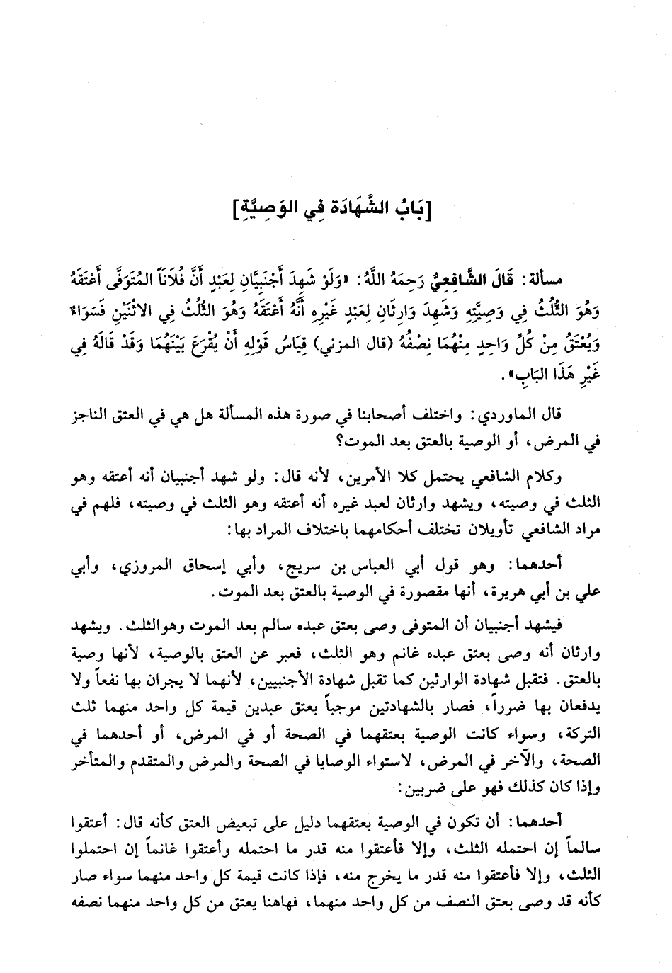 فَيَشْهَدُ أَجْنَبِيَّانِ أَنَّ الْمُتَوَفَّى وَصَّى بِعِتْقِ عَبْدِهِ سَالِمٍ بَعْدَ الْمَوْتِ وَهُوَ الثُّلُثُ. وَيَشْهَدُ وَارِثَانِ أَنَّهُ وَصَّى بِعِتْقِ عَبْدِهِ غَانِمٍ وَهُوَ الثُّلُثُ، فَعَبَّرَ عَنِ الْعِتْقِ بِالْوَصِيَّةِ، لِأَنَّها وَصِيَّةٌ بِالْعِتْقِ. فَتُقْبَلُ شَهَادَةُ الْوَارِثَيْنِ كَمَا تُقْبَلُ شَهَادَةُ الْأَجْنَبِيَّيْنِ، لِأَنَّهُمَا لَا يَجُرَّانِ بِهَا نَفْعًا وَلَا يَدْفَعَانِ بِهَا ضَرَرًا، فَصَارَ بِالشَّهَادَتَيْنِ مُوجَبًا بِعِتْقِ عَبْدَيْنِ قِيمَةُ كُلِّ وَاحِدٍ مِنْهُمَا ثُلُثُ التَّرِكَةِ، وَسَوَاءٌ كَانَتِ الْوَصِيَّةُ بِعِتْقِهِمَا فِي الصِّحَّةِ أَوِ فِي الْمَرَضِ، أَوْ أَحَدِهِمَا فِي الصِّحَّةِ، وَالْآخَرِ فِي الْمَرَضِ، لِاسْتِوَاءِ الْوَصَايَا فِي الصِّحَّةِ وَالْمَرَضِ وَالْمُتَقَدِّمِ وَالْمُتَأَخِّرِ وَإِذَا كَانَ كَذَلِكَ فَهُوَ عَلَى ضَرْبَيْنِ: