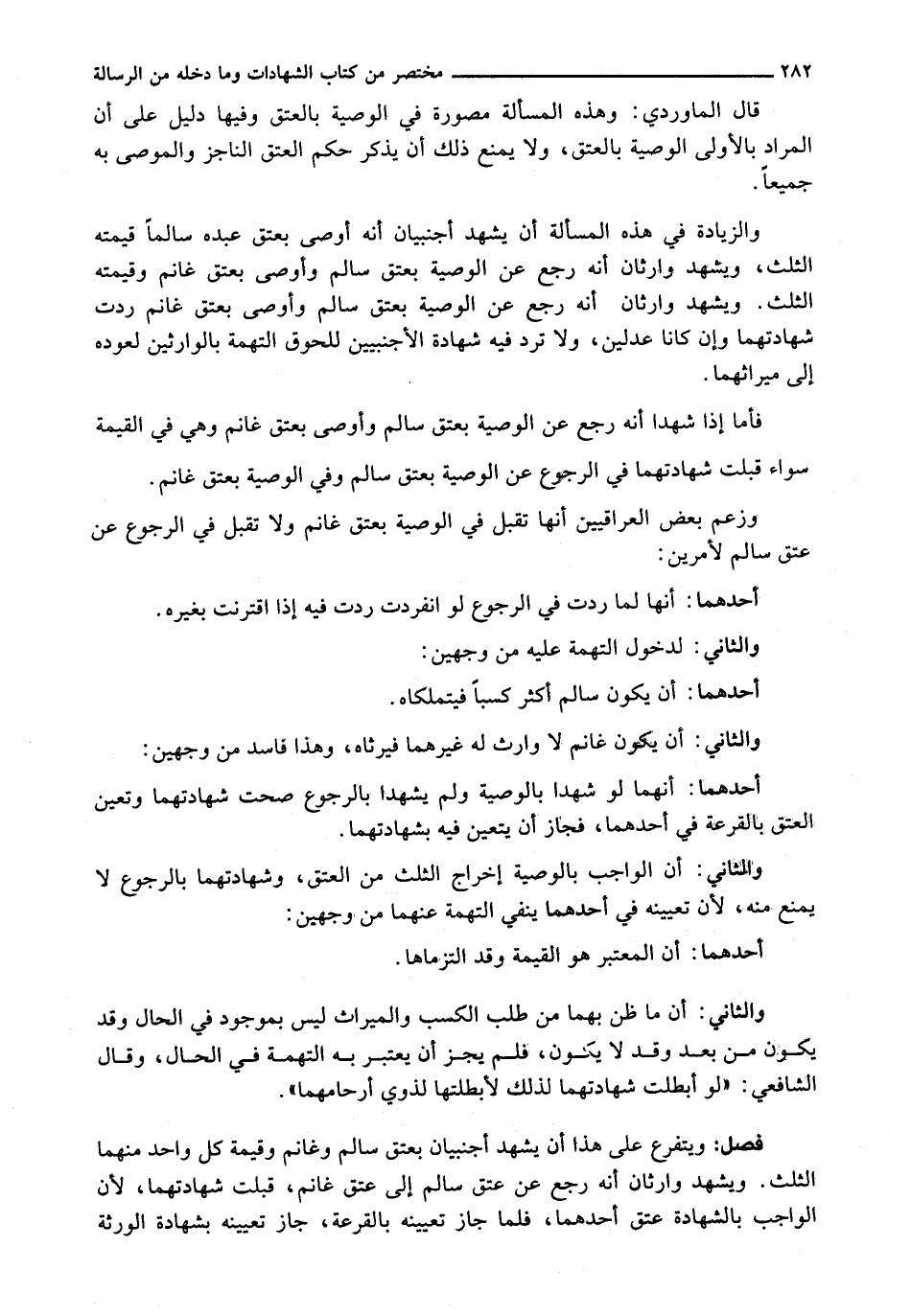 وَالزِّيَادَةُ فِي هَذِهِ الْمَسْأَلَةِ أَنْ يَشْهَدَ أَجْنَبِيَّانِ أَنَّهُ أَوْصَى بِعِتْقِ عَبْدِهِ سَالِمًا قِيمَتُهُ الثُّلُثُ، وَيَشْهَدُ وَارِثَانِ أَنَّهُ رَجَعَ عَنِ الْوَصِيَّةِ بِعِتْقِ سَالِمٍ وَأَوْصَى بِعِتْقِ غَانِمٍ وقيمته الثلث. ويشهد وارثان أنه رجع عن الْوَصِيَّةِ بِعِتْقِ سَالِمٍ وَأَوْصَى بِعِتْقِ غَانِمٍ رُدَّتْ شَهَادَتُهُمَا وَإِنْ كَانَا عَدْلَيْنِ، وَلَا تُرَدُّ فِيهِ شَهَادَةُ الْأَجْنَبِيَّيْنِ لِلُحُوقِ التُّهْمَةِ بِالْوَارِثَيْنِ لِعَوْدِهِ إِلَى مِيرَاثِهِمَا.
