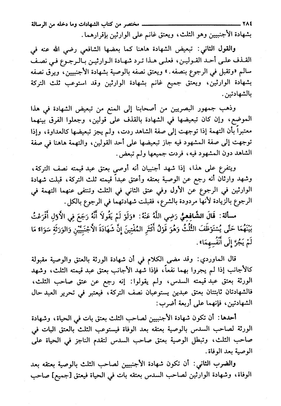 وَيَتَفَرَّعُ عَلَى هَذَا، إِذَا شَهِدَ أَجْنَبِيَّانِ أَنَّهُ أَوْصَى بِعِتْقِ عَبْدٍ قِيمَتُهُ نِصْفُ التَّرِكَةِ، وَشَهِدَ وَارِثَانِ أَنَّهُ رَجَعَ عَنِ الْوَصِيَّةِ بِعِتْقِهِ وَأَعْتَقَ عَبْدًا قِيمَتُهُ ثُلُثُ التَّرِكَةِ، قُبِلَتْ شَهَادَةُ الْوَارِثَيْنِ فِي الرُّجُوعِ عَنِ الْأَوَّلِ وَفِي عِتْقِ الثَّانِي فِي الثُّلُثِ وَتَنْتَفِي عَنْهُمَا التُّهْمَةُ فِي الرُّجُوعِ بِالزِّيَادَةِ لِأَنَّها مَرْدُودَةٌ بِالشَّرْعِ، فَقُبِلَتْ شَهَادَتُهُمَا فِي الرُّجُوعِ بِالْكُلِّ.
