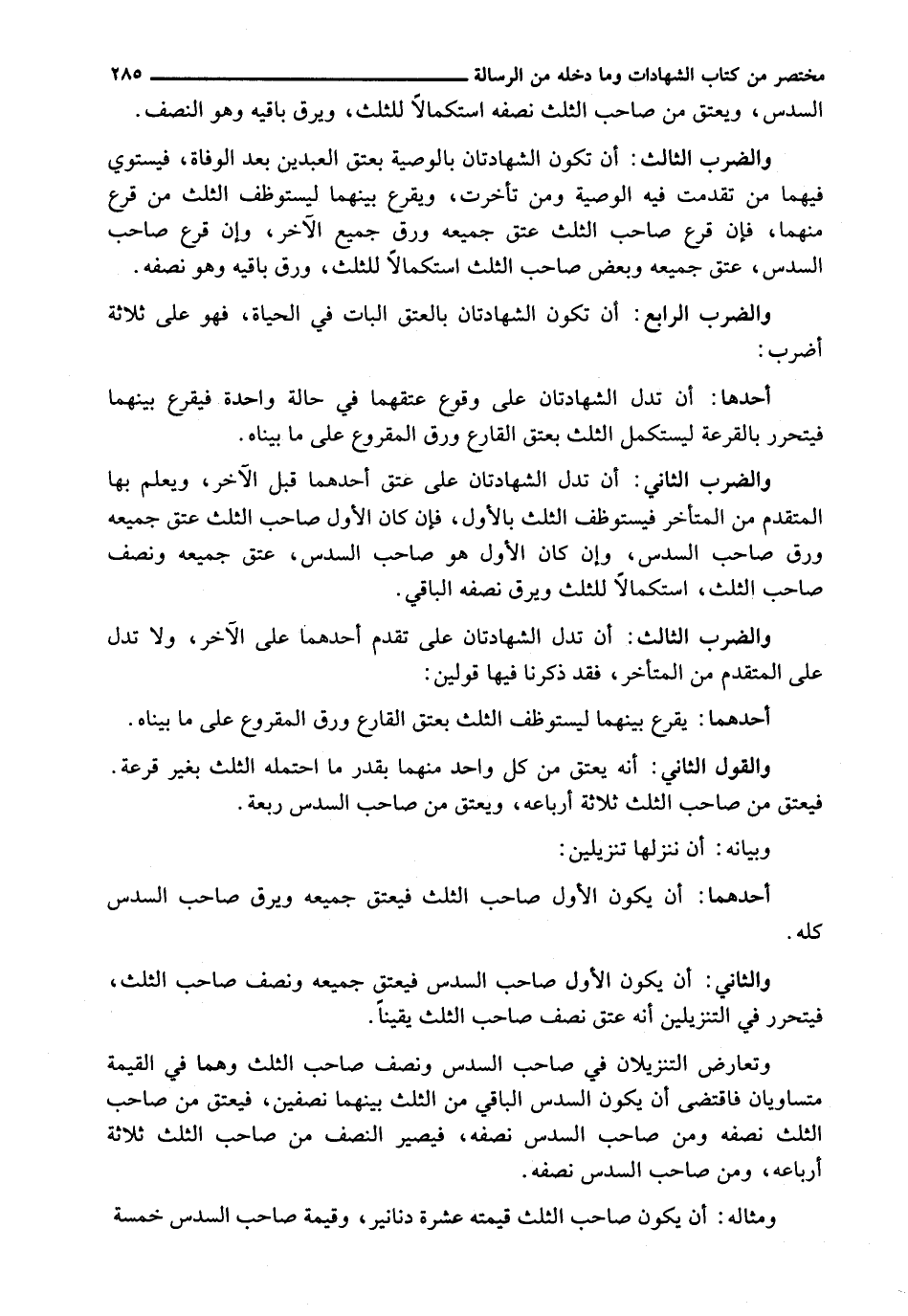وَالضَّرْبُ الثَّالِثُ: أَنْ تَكُونَ الشَّهَادَتَانِ بِالْوَصِيَّةِ بِعِتْقِ الْعَبْدَيْنِ بَعْدَ الْوَفَاةِ، فَيَسْتَوِي فِيهِمَا مَنْ تَقَدَّمَتْ فِيهِ الْوَصِيَّةُ وَمَنْ تَأَخَّرَتْ، وَيُقْرَعُ بَيْنَهُمَا لِيَسْتَوْظِفَ الثُّلُثَ مَنْ قَرَعَ مِنْهُمَا، فَإِنْ قَرَعَ صَاحِبُ الثُّلُثِ عُتِقَ جَمِيعُهُ وَرُقَّ جَمِيعُ الْآخَرِ، وَإِنْ قَرَعَ صَاحِبُ السُّدُسِ، عُتِقَ جَمِيعُهُ وَبَعْضُ صَاحِبِ الثُّلُثِ اسْتِكْمَالًا لِلثُّلُثِ، وَرُقَّ بَاقِيهِ وَهُوَ نِصْفُهُ.