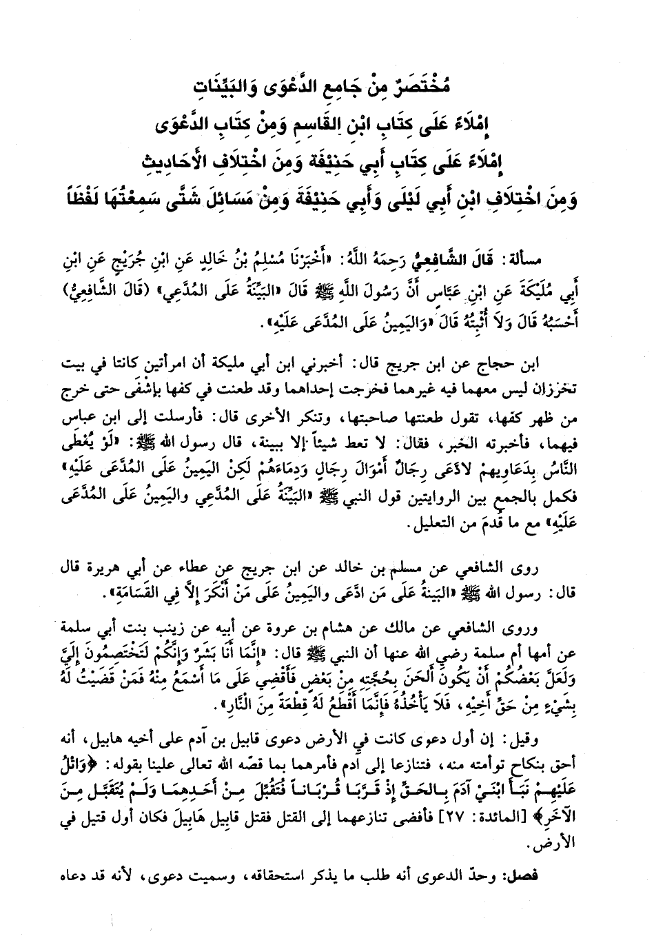 : قَالَ الشَّافِعِيُّ رَحِمَهُ اللَّهُ: " أَخْبَرْنَا مُسْلِمِ بْنِ خَالِدٍ عَنِ ابْنِ جُرَيْجٍ عَنْ ابْنِ أَبِي مُلَيْكَةَ عَنِ ابْنِ عَبَّاسٍ أَنَّ رَسُولَ اللَّهِ - صَلَّى اللَّهُ عَلَيْهِ وَسَلَّم َ - قَالَ " الْبَيِّنَةُ عَلَى الْمُدَّعِي " (قَالَ الشَّافِعِيُّ) أَحْسَبُهُ قَالَ وَلَا أُثْبِتُهُ قَالَ " وَالْيَمِينُ عَلَى الْمُدَّعَى عليه ".