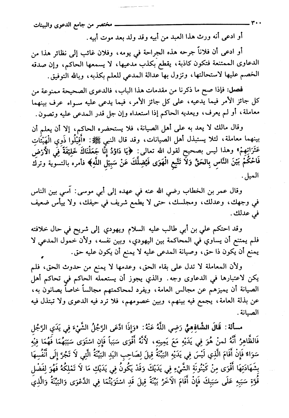 : قال الشافعي رضي الله عنه: " وَإِذَا ادَّعَى الرَّجُلُ الشَّيءَ فِي يَدَيِ الرَّجُلِ فَالظَّاهِرُ أَنَّهُ لِمَنْ هُوَ فِي يَدَيْهِ مَعَ يَمِينِهِ، لِأَنَّه أَقْوَى سَبَبًا فَإِنِ اسْتَوَى سَبَبُهُمَا فَهُمَا فِيهِ سَوَاءٌ فَإِنْ أَقَامَ الَّذِي لَيْسَ فِي يَدَيْهِ الْبَيِّنَةَ قِيلَ لِصَاحِبِ الْيَدِ الْبَيِّنَةُ الَّتِي لَا تَجُرُّ إِلَى أَنْفُسِهَا بِشَهَادَتِهَا أَقْوَى مِنْ كَيْنُونَةِ الشَّيءِ فِي يَدَيْكَ وَقَدْ يَكُونُ فِي يَدَيْكَ مَا لَا تَمْلِكُهُ فَهُوَ لِفَضْلِ قُوَةِ سَبَبِهِ عَلَى سَبَبِكَ فَإِنْ أَقَامَ الْآخَرُ بَيِّنَةً قِيلَ قَدِ اسْتَوَيْتُمَا فِي الدَّعْوَى وَالْبَيِّنَةِ والذي