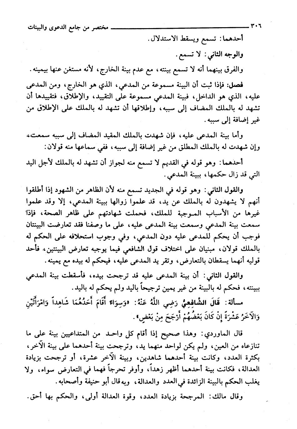 : فَإِذَا ثَبَتَ أَنَّ الْبَيِّنَةَ مَسْمُوعَةٌ مِنِ الْمُدَّعِي، الَّذِي هُوَ الْخَارِجُ، وَمِنَ الْمُدَّعَى عَلَيْهِ، الَّذِي هُوَ الدَّاخِلُ، فَبَيِّنَةُ الْمُدَّعِي مَسْمُوعَةٌ عَلَى التَّقْيِيدِ، وَالْإِطْلَاقِ، فَتَقْيِيدُهَا أَنْ تَشْهَدَ لَهُ بِالْمِلْكِ الْمُضَافِ إِلَى سَبَبِهِ، وَإِطْلَاقُهَا أَنْ تَشْهَدَ لَهُ بِالْمِلْكِ عَلَى الْإِطْلَاقِ مِنْ غَيْرِ إِضَافَةٍ إِلَى سَبَبِهِ.