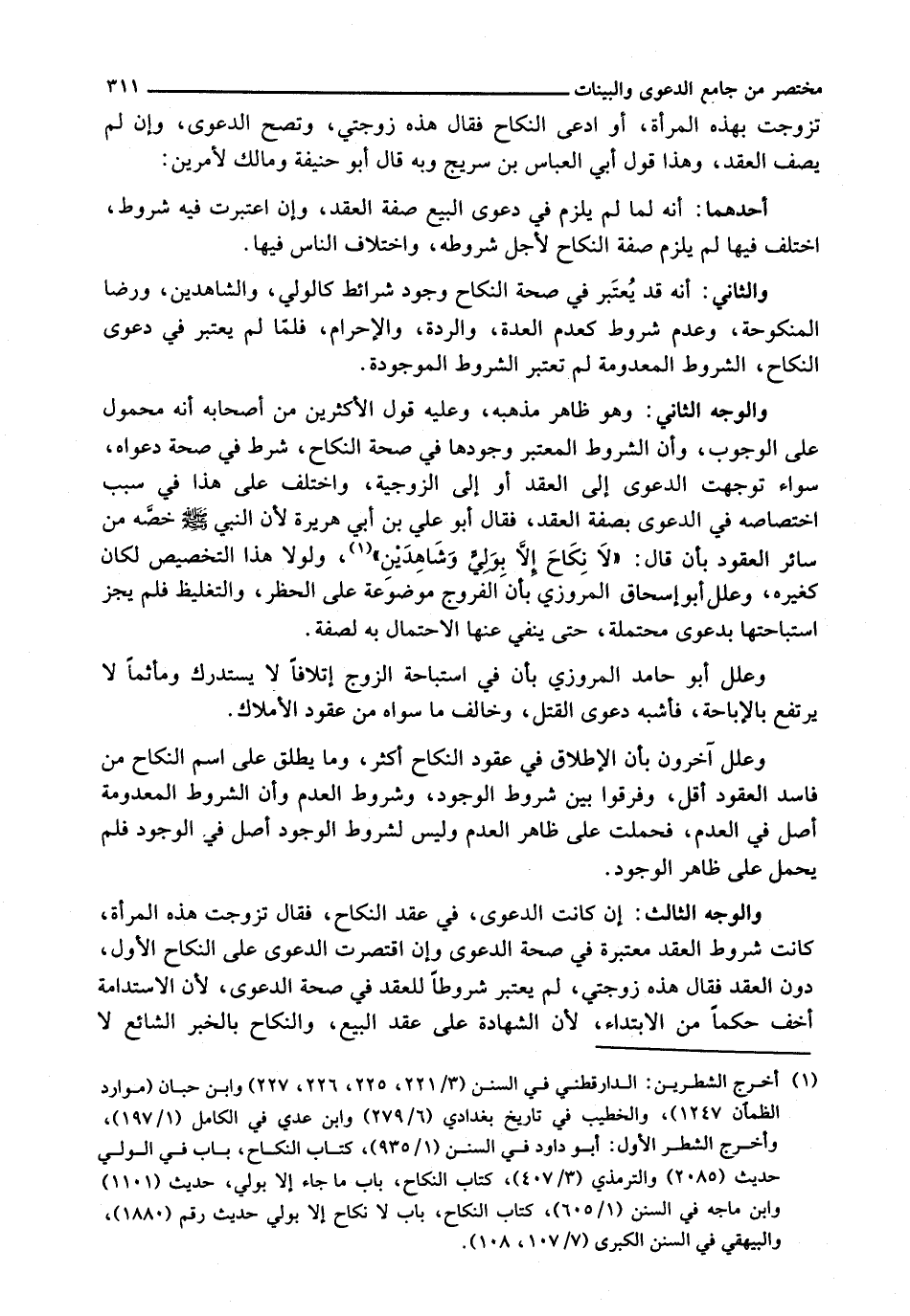 وَالْوَجْهُ الثَّانِي: وَهُوَ ظَاهِرُ مَذْهَبِهِ، وَعَلَيْهِ قَوْلُ الْأَكْثَرِينَ مِنْ أَصْحَابِهِ إِنَّهُ مَحْمُولٌ عَلَى الْوُجُوبِ، وَأَنَّ الشُّرُوطَ الْمُعْتَبَرُ وُجُودُهَا فِي صِحَّةِ النِّكَاحِ، شَرْطٌ فِي صِحَّةِ دَعَوَاهُ، سَوَاءٌ تَوَجَّهَتِ الدَّعْوَى إِلَى الْعَقْدِ أَوْ إِلَى الزَّوْجِيَّةِ، وَاخْتُلِفَ عَلَى هَذَا فِي سَبَبِ اخْتِصَاصِهِ فِي الدَّعْوَى بِصِفَةِ الْعَقْدِ، فَقَالَ أَبُو عَلِيِّ بْنِ أَبِي هُرَيْرَةَ لِأَنَّ النبي - صَلَّى اللَّهُ عَلَيْهِ وَسَلَّم َ - خَصَّهُ مِنْ سَائِرِ الْعُقُودِ بِأَنْ قَالَ: " لَا نِكَاحَ إِلَّا بِوَلِيٍّ وَشَاهِدَيْنِ "، وَلَوْلَا هَذَا التَّخْصِيصُ لَكَانَ كَغَيْرِهِ، وَعَلَّلَ أَبُو إِسْحَاقَ الْمَرْوَزِيُّ بِأَنَّ الْفُرُوجَ مَوْضُوعَةٌ عَلَى الْحَظْرِ، وَالتَّغْلِيظِ فَلَمْ يَجُزْ اسْتِبَاحَتُهَا بِدَعْوَى مُحْتَمَلَةٍ، حَتَّى يَنْفِيَ عَنْهَا الِاحْتِمَالَ بِهِ لِصِفَةٍ.