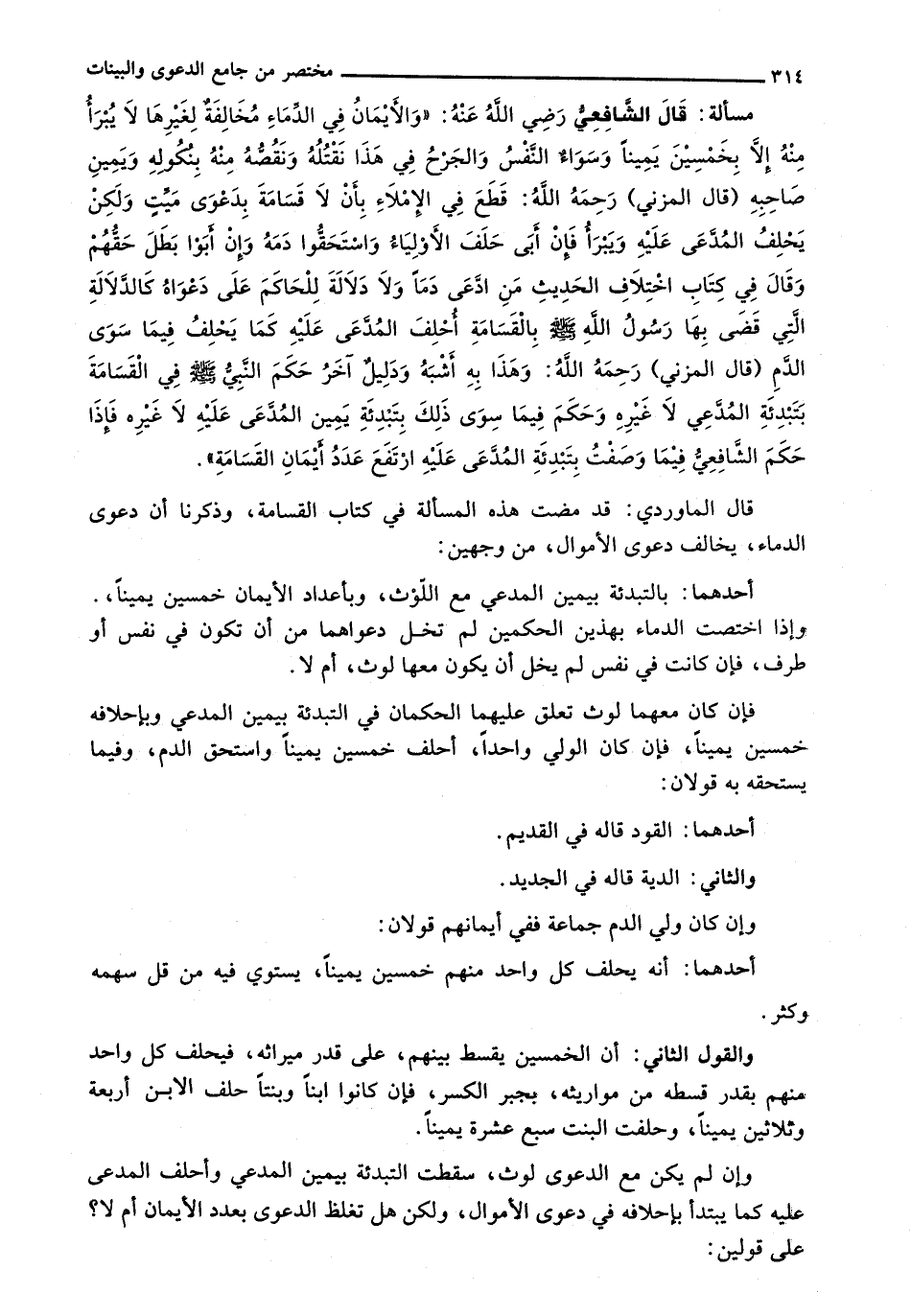 : قال الشافعي رضي الله عنه: " وَالْأَيْمَانُ فِي الدِّمَاءِ مُخَالِفَةٌ لِغَيْرِهَا لَا يُبْرَأُ مِنْهُ إِلَّا بِخَمْسِينَ يَمِينًا وَسَوَاءٌ النَّفْسُ وَالْجُرْحُ فِي هَذَا نَقْتُلُهُ وَنَقُصُّهُ مِنْهُ بِنُكُولِهِ وَيَمِينِ صاحبه (قال المزني) رحمه الله: قطع في الإملاء بأن لا قسامة بدعوى ميت ولكن يحلف المدعى عليه ويبرأ فإن أبى حلف الأولياء واستحقوا دمه وإن أبوا بطل حقهم وقال في الكتاب اختلاف الحديث من ادعى دما ولا دلالة للحاكم على دعواه كالدلالة التي قَضَى بِهَا رَسُولُ اللَّهِ - صَلَّى اللَّهُ عَلَيْهِ وَسَلَّم َ - بالقسامة أحلف المدعى عليه كما يحلف فيما سوى الدم (قال المزني) رحمه الله: وهذا به أشبه ودليل آخر حكم النبي - صَلَّى اللَّهُ عَلَيْهِ وَسَلَّم َ - في القسامة بتبدئة المدعي لا غيره وحكم فيما سوى ذلك بتبدئة يمين المدعى عليه لا غيره فإذا حكم الشافعي فيما وصفت بتبدئة المدعى عليه ارتفع عدد أيمان القسامة ".