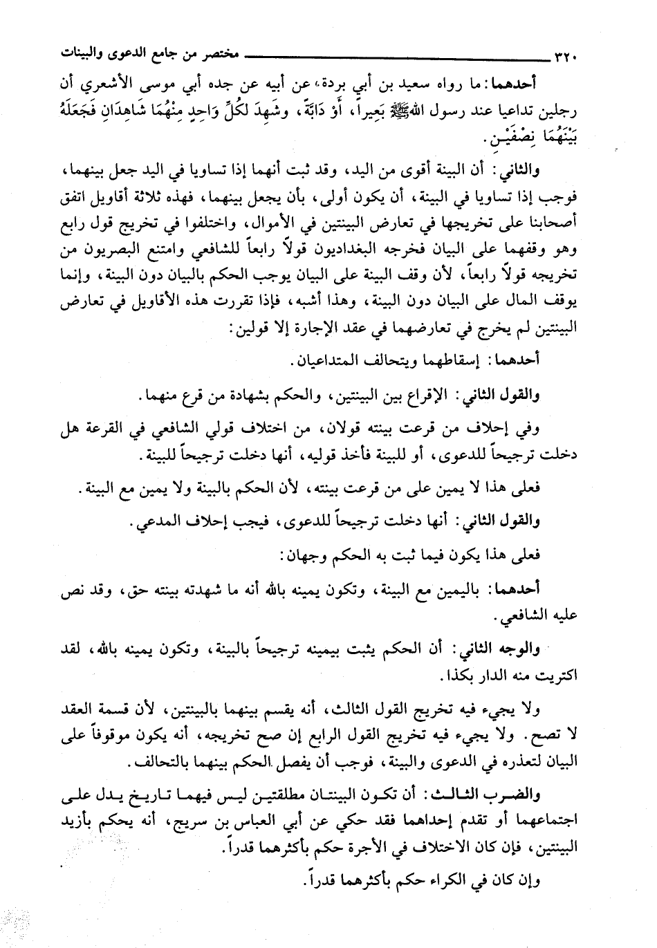 وَالثَّانِي: إِنَّ الْبَيِّنَةَ أَقْوَى مِنَ الْيَدِ، وَقَدْ ثَبَتَ أَنَّهُمَا إِذَا تَسَاوَيَا فِي الْيَدِ جُعِلَ بَيْنَهُمَا، فَوَجَبَ إِذَا تَسَاوَيَا فِي الْبَيِّنَةِ، أَنْ يَكُونَ أَوْلَى، بِأَنْ يُجْعَلَ بَيْنَهُمَا، فَهَذِهِ ثَلَاثَةُ أَقَاوِيلَ اتَّفَقَ أَصْحَابُنَا عَلَى تَخْرِيجِهَا فِي تَعَارُضِ الْبَيِّنَتَيْنِ فِي الْأَمْوَالِ، وَاخْتَلَفُوا فِي تَخْرِيجِ قَوْلٍ رَابِعٍ وَهُوَ وَقَفَهُمَا عَلَى الْبَيَانِ فَخَرَّجَهُ الْبَغْدَادِيُّونَ قَوْلًا رَابِعًا لِلشَّافِعِيِّ وَامْتَنَعَ الْبَصْرِيُّونَ مِنْ تَخْرِيجِهِ قَوْلًا رَابِعًا، لِأَنَّ وَقْفَ الْبَيِّنَةِ عَلَى الْبَيَانِ يُوجِبُ الْحُكْمَ بِالْبَيَانِ دُونَ الْبَيِّنَةِ، وَإِنَّمَا يُوقَفُ الْمَالُ عَلَى الْبَيَانِ دُونَ الْبَيِّنَةِ، وَهَذَا أَشْبَهُ، فَإِذَا تَقَرَّرَتْ هَذِهِ الْأَقَاوِيلُ فِي تَعَارُضِ الْبَيِّنَتَيْنِ لَمْ يُخَرَّجْ فِي تَعَارُضِهِمَا فِي عَقْدِ الْإِجَارَةِ إِلَّا قَوْلَيْنِ: