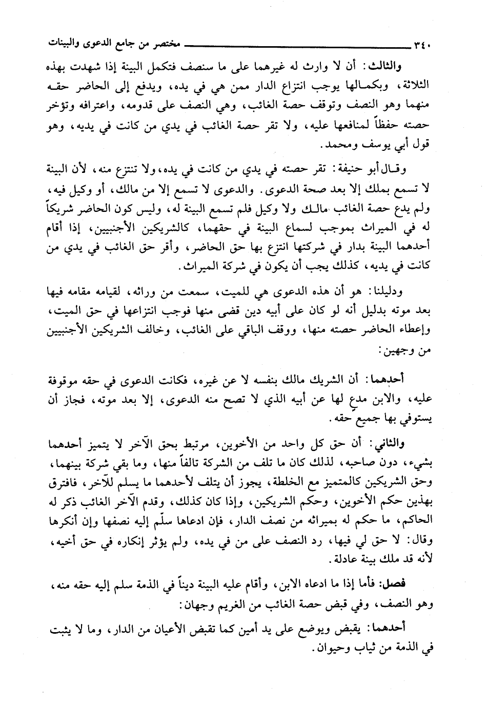 وَالثَّانِي: إِنَّ حَقَّ كُلِّ وَاحِدٍ مِنَ الْأَخَوَيْنِ، مُرْتَبِطٌ بِحَقِّ الْآخَرِ لَا يَتَمَيَّزُ أَحَدُهُمَا بِشَيْءٍ، دُونَ صَاحِبِهِ، لِذَلِكَ كَانَ مَا تَلَفَ مِنَ الشَّرِكَةِ تَالِفًا مِنْهَا، وَمَا بَقِيَ شَرِكَةً بَيْنَهُمَا، وَحَقُّ الشَّرِيكَيْنِ كَالْمُتَمَيِّزِ مَعَ الْخُلْطَةِ، يَجُوزُ أَنْ يَتْلَفَ لِأَحَدِهِمَا مَا يَسَلَمُ لِلْآخَرِ، فَافْتَرَقَ بِهَذَيْنِ حُكْمُ الْأَخَوَيْنِ، وَحُكْمُ الشَّرِيكَيْنِ، وَإِذَا كَانَ كَذَلِكَ، وَقَدِمَ الْآخَرُ الْغَائِبُ ذَكَرَ لَهُ الْحَاكِمُ، مَا حَكَمَ لَهُ بِمِيرَاثِهِ مِنْ نِصْفِ الدَّارِ، فَإِنِ ادَّعَاهَا سَلَّمَ إِلَيْهِ نِصْفَهَا وَإِنْ أَنْكَرَهَا وَقَالَ: لَا حَقَّ لِي فِيهَا، رَدَّ النِّصْفَ عَلَى مَنْ فِي يَدِهِ، وَلَمْ يُؤَثِّرْ إِنْكَارُهُ فِي حَقِّ أَخِيهِ، لِأَنَّه قَدْ مَلَكَ بَيِّنَةً عَادِلَةً.
