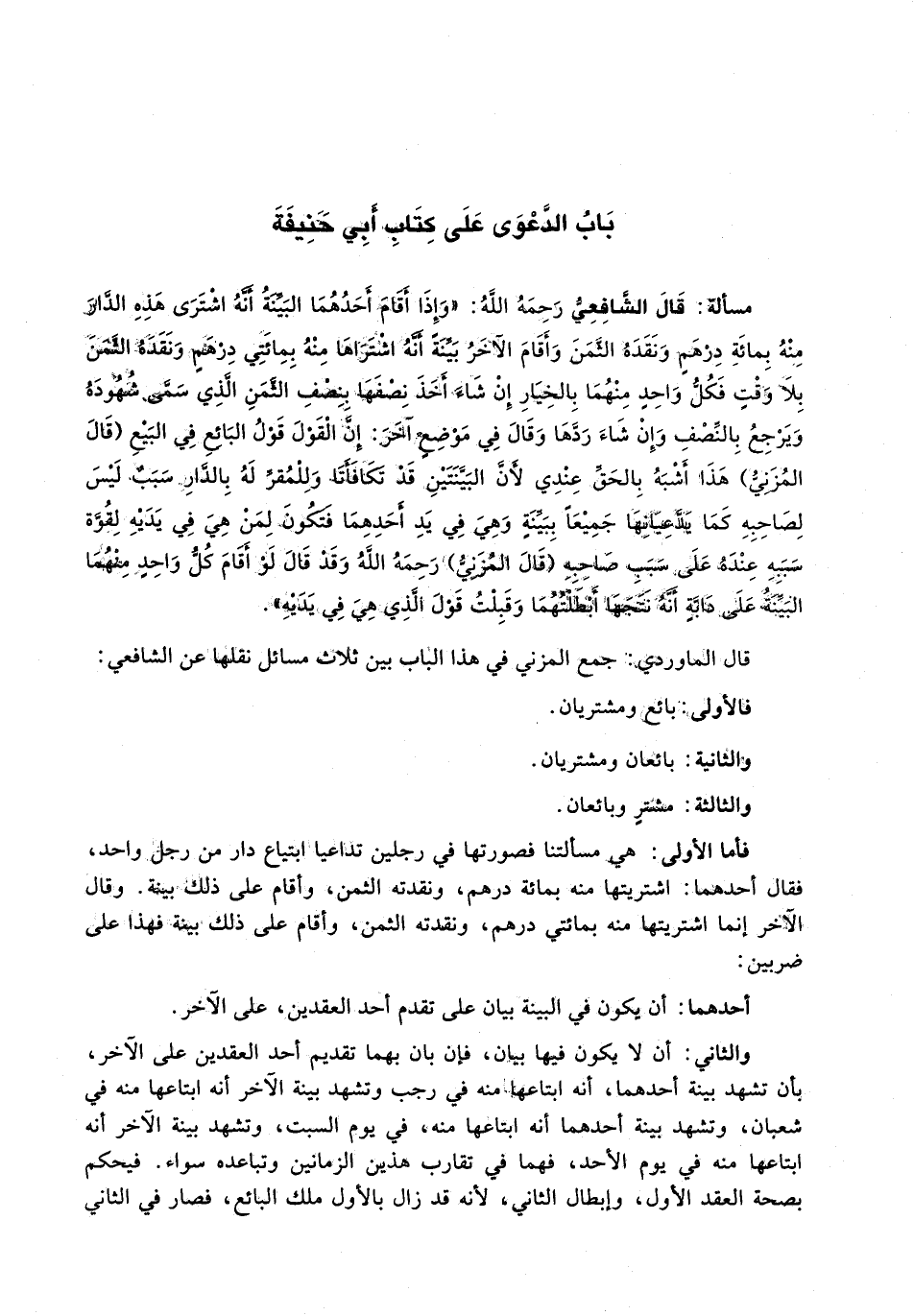 : قَالَ الشَّافِعِيُّ رَحِمَهُ اللَّهُ: " وَإِذَا أَقَامَ أَحَدُهُمَا الْبَيِّنَةَ أَنَّهُ اشْتَرَى هَذِهِ الدَّارَ مِنْهُ بِمِائَةِ دِرْهَمٍ وَنَقَدَهُ الثَّمَنَ وَأَقَامَ الْآخَرُ بَيِّنَةً أَنَّهُ اشْتَرَاهَا مِنْهُ بِمِائَتِي دِرْهَمٍ وَنَقَدَهُ الثَّمَنَ بِلَا وَقْتٍ فَكُلُّ وَاحِدٍ مِنْهُمَا بِالْخِيَارِ إِنْ شَاءَ أَخَذَ نِصْفَهَا بِنِصْفِ الثَّمَنِ الَّذِي سَمَّى شُهُودَهُ وَيَرْجِعُ بِالنِّصْفِ وَإِنْ شَاءَ رَدَّهَا وَقَالَ فِي مَوْضِعٍ آخَرَ: إِنً الْقَوْلَ قَوْلُ الْبَائِعِ فِي الْبَيْعِ (قَالَ الْمُزَنِيُّ) هَذَا أَشْبَهُ بِالْحَقِّ عِنْدِي لأن البينتين قد تكافأتا وللمقر له بالدار سبب ليس لصاحبه كما يدعيانها جميعا ببينة وهي في يد أحدهما فتكون لمن هي في يديه لقوة سببه عنده على سبب صاحبه (قال المزني) رحمه الله وقد قال لو أقام كل واحد منهما البينة على دابة أنه نتجها أبطلتهما وقبلت قول الذي هي في يديه ".