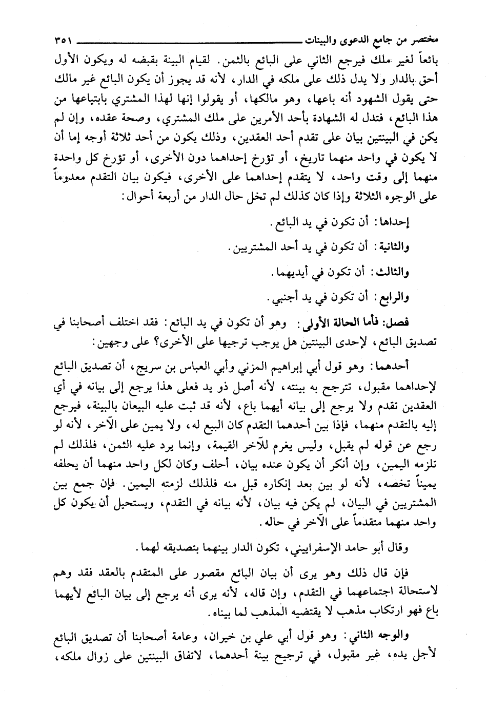 بَائِعًا لِغَيْرِ مِلْكٍ فَيَرْجِعُ الثَّانِي عَلَى الْبَائِعِ بِالثَّمَنِ. لِقِيَامِ الْبَيِّنَةِ بِقَبْضِهِ لَهُ وَيَكُونُ الْأَوَّلُ أَحَقُّ بِالدَّارِ وَلَا يَدُلُّ ذَلِكَ عَلَى مِلْكِهِ فِي الدَّارِ، لِأَنَّه قَدْ يَجُوزُ أَنْ يَكُونَ الْبَائِعُ غَيْرُ مَالِكٍ حَتَّى يَقُولَ الشُّهُودُ إِنَّهُ بَاعَهَا، وَهُوَ مَالِكُهَا، أَوْ يَقُولُوا إِنَّهَا لِهَذَا الْمُشْتَرِي بِابْتِيَاعِهَا مِنْ هَذَا الْبَائِعِ، فَتَدُلُّ لَهُ الشَّهَادَةُ بِأَحَدِ الْأَمْرَيْنِ عَلَى مِلْكِ الْمُشْتَرِي، وَصِحَّةِ عَقْدِهِ، وَإِنْ لَمْ يَكُنْ فِي الْبَيِّنَتَيْنِ بَيَانٌ عَلَى تَقَدُّمِ أَحَدِ الْعَقْدَيْنِ، وَذَلِكَ يَكُونُ مِنْ أَحَدِ ثَلَاثَةِ أَوْجُهٍ إِمَّا أَنْ لَا يَكُونَ فِي وَاحِدٍ مِنْهُمَا تَارِيخٌ، أَوْ تُؤَرَّخُ إِحْدَاهُمَا دُونَ الْأُخْرَى، أَوْ تُؤَرَّخُ كُلُّ وَاحِدَةٍ مِنْهُمَا إِلَى وَقْتٍ وَاحِدٍ، لَا يَتَقَدَّمُ إِحْدَاهُمَا عَلَى الْأُخْرَى، فَيَكُونُ بَيَانُ التَّقَدُّمِ مَعْدُومًا عَلَى الْوُجُوهِ الثَّلَاثَةِ وَإِذَا كَانَ كَذَلِكَ لَمْ تَخْلُ حَالُ الدَّارِ مِنْ أَرْبَعَةِ أَحْوَالٍ: