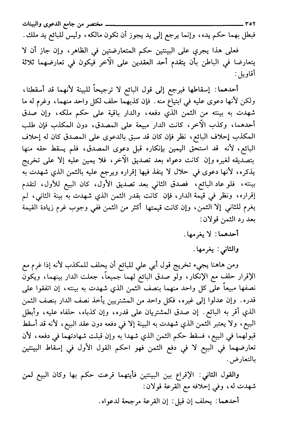 أحدهما: إِسْقَاطُهَا فَيَرْجِعُ إِلَى قَوْلِ الْبَائِعِ لَا تَرْجِيحًا لِلْبَيِّنَةِ لِأَنَّهمَا قَدْ أُسْقِطَتَا، وَلَكِنْ لِأَنَّها دَعْوَى عَلَيْهِ فِي ابْتِيَاعٍ مِنْهُ. فَإِنْ كَذَّبَهُمَا حَلَفَ لِكُلِّ وَاحِدٍ مِنْهُمَا، وَغَرِمَ لَهُ مَا شَهِدَتْ بِهِ بَيِّنَتُهُ مِنَ الثَّمَنِ الَّذِي دَفَعَهُ، وَالدَّارُ بَاقِيَةٌ عَلَى حُكْمِ مِلْكِهِ، وَإِنْ صَدَقَ أَحَدُهُمَا، وَكَذَبَ الْآخَرُ، كَانَتِ الدَّارُ مَبِيعَةٌ عَلَى الْمُصَدِّقِ، دُونَ الْمُكَذِّبِ فَإِنْ طَلَبَ الْمُكَذِّبُ إِحْلَافَ الْبَائِعِ، نُظِرَ فَإِنْ كَانَ قَدْ سَبَقَ بِالدَّعْوَى عَلَى الْمُصَدِّقِ كَانَ لَهُ إِحْلَافُ الْبَائِعِ، لِأَنَّه قَدِ اسْتَحَقَّ الْيَمِينَ بِإِنْكَارِهِ قَبْلَ دَعْوَى الْمُصَدِّقِ، فَلَمْ يَسْقُطْ حَقُّهُ مِنْهَا بِتَصْدِيقِهِ لِغَيْرِهِ وَإِنْ كَانَتْ دَعْوَاهُ بَعْدَ تَصْدِيقِ الْآخَرِ، فَلَا يَمِينَ عَلَيْهِ إِلَّا عَلَى تَخْرِيجٍ يَذْكُرُهُ، لِأَنَّها دَعْوَى فِي حَلَالٍ لَا يَنْفُذُ فِيهَا إِقْرَارُهُ وَيَرْجِعُ عَلَيْهِ بِالثَّمَنِ الَّذِي شَهِدَتْ بِهِ بَيِّنَتُهُ، فَلَوْ عَادَ الْبَائِعُ، فَصَدَّقَ الثَّانِي بَعْدَ تَصْدِيقِ الْأَوَّلِ، كَانَ الْبَيْعُ لِلْأَوَّلِ، لِتَقَدُّمِ إِقْرَارِهِ، وَنُظِرَ فِي قِيمَةِ الدَّارِ، فَإِنْ كَانَتْ بِقَدْرِ الثَّمَنِ الَّذِي شَهِدَتْ بِهِ بَيِّنَةُ الثَّانِي، لَمْ يُغَرَّمْ لِلثَّانِي إِلَّا الثَّمَنَ، وَإِنْ كَانَتْ قِيمَتُهَا أَكْثَرُ مِنَ الثَّمَنِ فَفِي وُجُوبِ غُرْمِ زِيَادَةِ الْقِيمَةِ بَعْدَ رَدِّ الثَّمَنِ قَوْلَانِ: