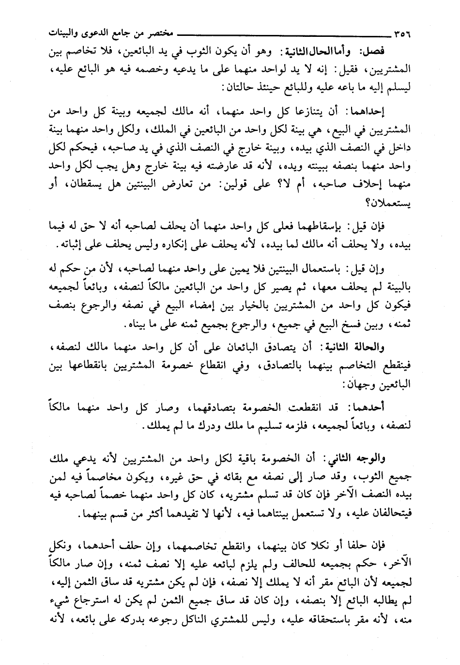 : وأما الحالة الثَّانِيَةُ: وَهُوَ أَنْ يَكُونَ الثَّوْبُ فِي يَدِ الْبَائِعَيْنِ، فَلَا تَخَاصُمَ بَيْنَ الْمُشْتَرِيَيْنِ، فَقِيلَ: إِنَّهُ لَا يَدَ لِوَاحِدٍ مِنْهُمَا عَلَى مَا يَدَّعِيهِ وَخَصْمُهُ فِيهِ هُوَ الْبَائِعُ عَلَيْهِ، لِيُسَلِّمَ إِلَيْهِ مَا بَاعَهُ عَلَيْهِ وَلِلْبَائِعِ حِينَئِذٍ حَالَتَانِ: