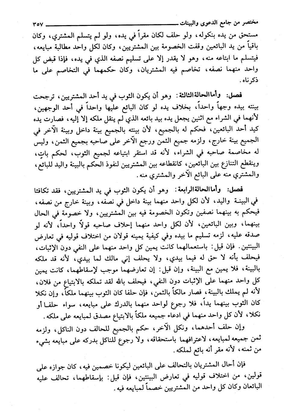 : وَأَمَّا الْحَالَةُ الثَّالِثَةُ: وَهُوَ أَنْ يَكُونَ الثَّوْبُ فِي يَدِ أَحَدِ الْمُشْتَرِيَيْنِ، تَرَجَّحَتْ بَيِّنَتُهُ بِيَدِهِ وَجْهًا وَاحِدًا، بِخِلَافِ يَدِهِ لَوْ كَانَ الْبَائِعُ عَلَيْهَا وَاحِدًا فِي أَحَدِ الْوَجْهَيْنِ، لِأَنَّهُمَا فِي الشِّرَاءِ مَعَ اثْنَيْنِ يَجْعَلُ يَدَهُ بِيَدِ بَائِعِهِ الَّذِي لَمْ يُنْقَلْ مِلْكُهُ إِلَّا إِلَيْهِ، فَصَارَتْ يَدُهُ كَيْدَ أَحَدِ الْبَائِعَيْنِ، فَحُكِمَ لَهُ بِالْجَمِيعِ، لِأَنَّ بَيِّنَتَهُ بِالْجَمِيعِ بَيِّنَةُ دَاخِلٍ وَبَيِّنَةُ الْآخَرِ فِي الْجَمِيعِ بَيِّنَةُ خَارِجٍ، وَلَزِمَهُ جَمِيعُ الثَّمَنِ وَرَجَعَ الْآخَرُ عَلَى صَاحِبِهِ بِجَمِيعِ الثَّمَنِ، وَلَيْسَ لَهُ مُخَاصَمَةُ صَاحِبِهِ فِي الشِّرَاءِ، لِأَنَّهُ قَدِ اسْتَقَرَّ ابْتِيَاعُهُ لِجَمِيعِ الثَّوْبِ، لِحُكْمٍ بَاتٍّ، وَيَنْقَطِعُ التَّنَازُعُ بَيْنَ الْبَائِعَيْنِ، كَانْقِطَاعِهِ بَيْنَ الْمُشْتَرِيَيْنِ لِنُفُوذِ الْحُكْمِ بِالْبَيِّنَةِ وَالْيَدِ لِلْبَائِعِ، وَالْمُشْتَرِي مِنْهُ عَلَى الْبَائِعِ الْآخَرِ وَالْمُشْتَرِي مِنْهُ.