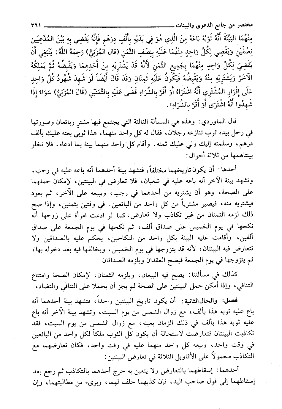 أَحَدُهَا: أَنْ يَكُونَ تَارِيخُهُمَا مُخْتَلِفًا، فَتَشْهَدُ بَيِّنَةُ أَحَدِهِمَا أَنَّهُ بَاعَهُ عَلَيْهِ فِي رَجَبٍ، وَتَشْهَدُ بَيِّنَةُ الْآخَرِ أَنَّهُ بَاعَهُ عليه في شعبان، فلا تعرض فِي الْبَيِّنَتَيْنِ، لِإِمْكَانِ حَمْلِهِمَا عَلَى الصِّحَّةِ، وَهُوَ أَنْ يَشْتَرِيَهُ مِنْ أَحَدِهِمَا فِي رَجَبٍ، وَيَبِيعَهُ عَلَى الْآخَرِ، ثُمَّ يَعُودُ فَيَشْتَرِيهِ مِنْهُ، فَيَصِيرُ مُشْتَرِيًا مِنْ كُلِّ وَاحِدٍ مِنَ الْبَائِعَيْنِ. فِي وَقْتَيْنِ بِثَمَنَيْنِ، وَإِذَا صَحَّ ذَلِكَ لَزِمَهُ الثَّمَنَانِ مِنْ غَيْرِ تَكَاذُبٍ وَلَا تَعَارُضٍ، كَمَا لَوِ ادَّعَتِ امْرَأَةٌ عَلَى زَوْجِهَا أَنَّهُ نَكَحَهَا فِي يَوْمِ الْخَمِيسِ عَلَى صَدَاقِ أَلْفٍ، ثُمَّ نَكَحَهَا فِي يَوْمِ الْجُمْعَةِ عَلَى صَدَاقِ أَلْفَيْنِ، وَأَقَامَتْ عليه البينة بكل واحد من النكاحين، يحكم عَلَيْهِ بِالصَّدَاقَيْنِ وَلَا تَتَعَارَضُ فِيهِ الْبَيِّنَتَانِ، لِأَنَّهُ قد يتزوجها في يوم الخميس، ويخالفها فِيهِ بَعْدَ دُخُولِهِ بِهَا، ثُمَّ يَتَزَوَّجُهَا فِي يَوْمِ الْجُمْعَةِ فَيَصِحُّ الْعَقْدَانِ وَيَلْزَمُهُ الصَّدَاقَانِ.