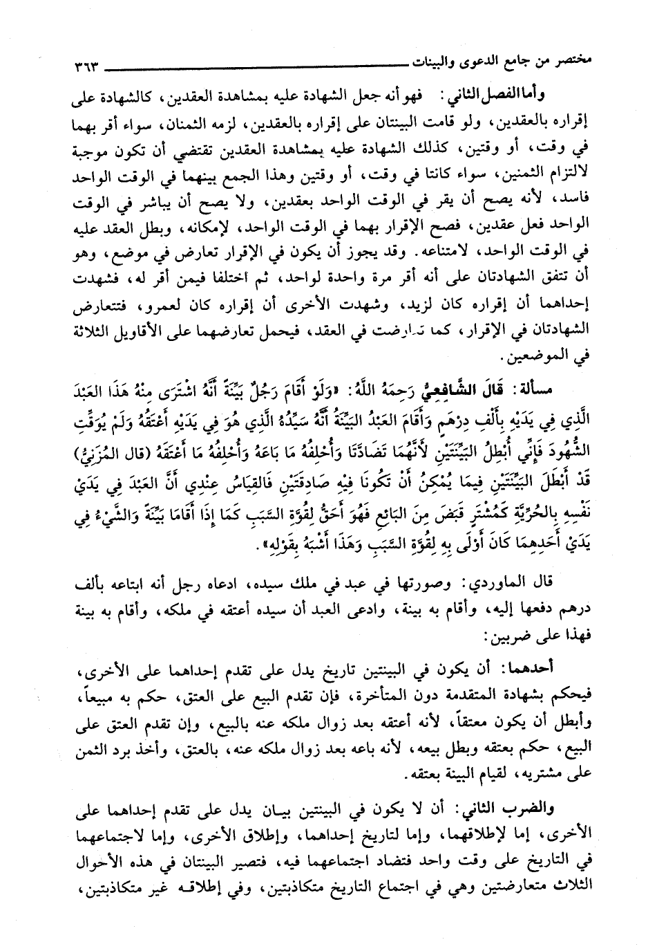 وَأَمَّا الْفَصْلُ الثَّانِي: فَهُوَ أَنَّهُ جَعَلَ الشَّهَادَةَ عَلَيْهِ بِمُشَاهَدَةِ الْعَقْدَيْنِ، كَالشَّهَادَةِ عَلَى إِقْرَارِهِ بِالْعَقْدَيْنِ، وَلَوْ قَامَتِ الْبَيِّنَتَانِ عَلَى إِقْرَارِهِ بِالْعَقْدَيْنِ، لَزِمَهُ الثَّمَنَانِ، سَوَاءٌ أَقَرَّ بِهِمَا فِي وَقْتٍ، أَوْ وَقْتَيْنِ، كَذَلِكَ الشَّهَادَةُ عَلَيْهِ بِمُشَاهَدَةِ الْعَقْدَيْنِ تَقْتَضِي أَنْ تَكُونَ مُوجِبَةً لِالْتِزَامِ الثَّمَنَيْنِ، سَوَاءٌ كَانَتَا فِي وَقْتٍ، أَوْ وَقْتَيْنِ وَهَذَا الْجَمْعُ بَيْنَهُمَا فِي الْوَقْتِ الْوَاحِدِ فَاسِدٌ، لِأَنَّهُ يَصِحُّ أَنْ يُقِرَّ فِي الْوَقْتِ الْوَاحِدِ بِعَقْدَيْنِ، وَلَا يَصِحُّ أَنْ يُبَاشِرَ فِي الْوَقْتِ الْوَاحِدِ فِعْلُ عَقْدَيْنِ، فَصَحَّ الْإِقْرَارُ بِهِمَا فِي الْوَقْتِ الْوَاحِدِ، لِإِمْكَانِهِ، وَبَطَلَ الْعَقْدُ عَلَيْهِ فِي الْوَقْتِ الْوَاحِدِ، لِامْتِنَاعِهِ. وَقَدْ يَجُوزُ أَنْ يَكُونَ فِي الْإِقْرَارِ تُعَارِضٌ فِي مَوْضِعٍ، وَهُوَ أَنْ تَتَّفِقَ الشَّهَادَتَانِ عَلَى أَنَّهُ أَقَرَّ مَرَّةً وَاحِدَةً لِوَاحِدٍ، ثُمَّ اخْتَلَفَا فِيمَنْ أَقَرَّ لَهُ، فَشَهِدَتْ إِحْدَاهُمَا أَنَّ إِقْرَارَهُ كَانَ لِزَيْدٍ، وَشَهِدَتِ الْأُخْرَى أَنَّ إِقْرَارَهُ كَانَ لِعَمْرٍو، فَتَتَعَارَضُ الشَّهَادَتَانِ فِي الْإِقْرَارِ، كَمَا تَعَارَضَتْ فِي الْعَقْدِ، فَيُحْمَلُ تَعَارُضُهُمَا عَلَى الْأَقَاوِيلِ الثَّلَاثَةِ في الموضعين.