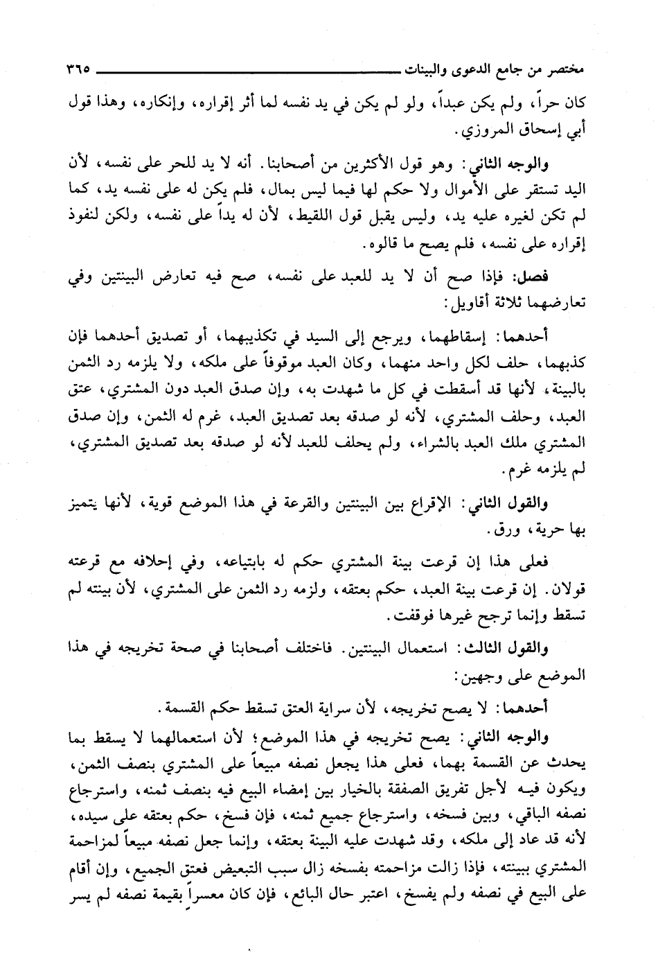: فَإِذَا صَحَّ أَنْ لَا يَدَ لِلْعَبْدِ عَلَى نَفْسِهِ، صَحَّ فِيهِ تَعَارُضُ الْبَيِّنَتَيْنِ وَفِي تَعَارُضِهِمَا ثَلَاثَةُ أَقَاوِيلَ: