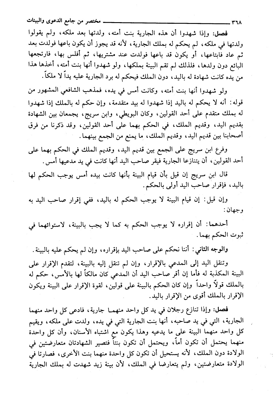 : وَإِذَا تَنَازَعَ رَجُلَانِ فِي يَدِ كُلِّ وَاحِدٍ مِنْهُمَا جَارِيَةٌ، فَادَّعَى كُلُّ وَاحِدٍ مِنْهُمَا الْجَارِيَةَ، الَّتِي فِي يَدِ صَاحِبِهِ، أَنَّهَا بِنْتُ الْجَارِيَةِ الَّتِي فِي يَدِهِ، وُلِدَتْ عَلَى مِلْكِهِ، وَيُقِيمُ كُلُّ وَاحِدٍ مِنْهُمَا الْبَيِّنَةَ عَلَى مَا يَدَّعِيهِ وَهَذَا يَكُونُ مَعَ اشْتِبَاهِ الْأَسْنَانِ، وَأَنَّ كُلَّ وَاحِدَةٍ مِنْهُمَا يُحْتَمَلُ أَنْ تَكُونَ أُمًّا، وَيُحْتَمَلُ أَنْ تكون كل واحدة بِنْتًا فَتَصِيرُ الشَّهَادَتَانِ مُتَعَارِضَتَيْنِ فِي الْوِلَادَةِ دُونَ الْمِلْكِ، لِأَنَّهُ يَسْتَحِيلُ أَنْ تَكُونَ كُلُّ وَاحِدَةٍ مِنْهُمَا بِنْتَ الْأُخْرَى، فَصَارَتَا فِي الْوِلَادَةِ مُتَعَارِضَتَيْنِ، وَلَمْ يَتَعَارَضَا فِي الْمِلْكِ، لِأَنَّ بَيِّنَةَ زَيْدٍ شَهِدَتْ لَهُ بِمِلْكِ الْجَارِيَةِ