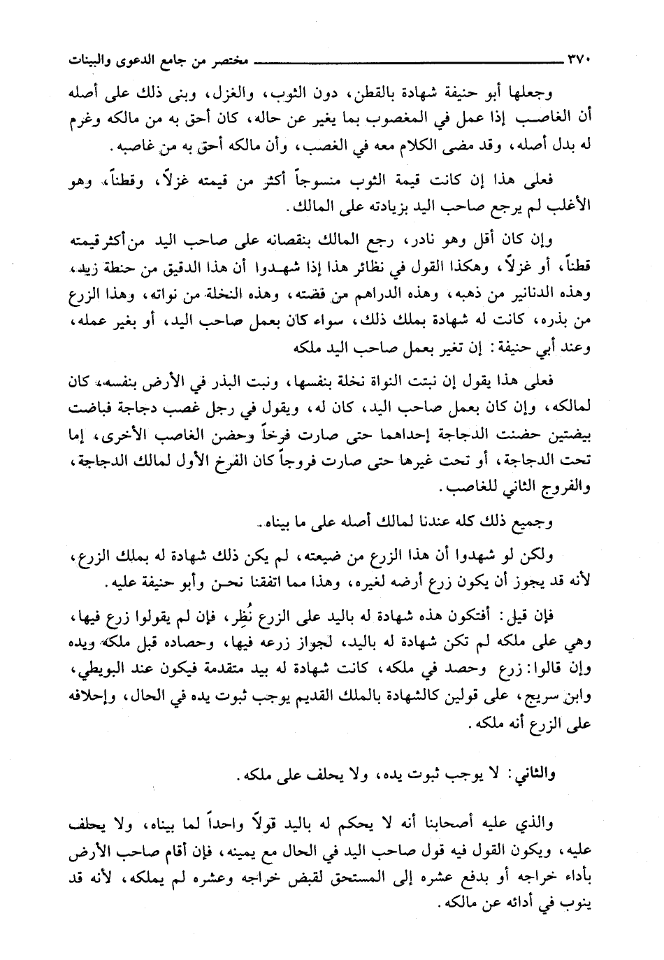 وَإِنْ كَانَ أَقَلَّ وَهُوَ نَادِرٌ، رَجَعَ الْمَالِكُ بِنُقْصَانِهِ عَلَى صَاحِبِ الْيَدِ مِنْ أَكْثَرِ قِيمَتِهِ قُطْنًا، أَوْ غَزْلًا، وَهَكَذَا الْقَوْلُ فِي نَظَائِرِ هَذَا إِذَا شَهِدُوا أَنَّ هَذَا الدَّقِيقَ مِنْ حِنْطَةِ زَيْدٍ، وَهَذِهِ الدَّنَانِيرَ مِنْ ذَهَبِهِ، وَهَذِهِ الدَّرَاهِمَ مِنْ فِضَّتِهِ، وَهَذِهِ النَّخْلَةَ مِنْ نَوَاتِهِ، وَهَذَا الزَّرْعَ مِنْ بَذْرِهِ، كَانَتْ لَهُ شَهَادَةٌ بِمِلْكِ ذَلِكَ، سَوَاءً كَانَ بِعَمَلِ صَاحِبِ الْيَدِ، أَوْ بِغَيْرِ عَمَلِهِ، وَعِنْدَ أَبِي حَنِيفَةَ: إِنْ تَغَيَّرَ بِعَمَلِ صَاحِبِ الْيَدِ مِلْكَهُ.
