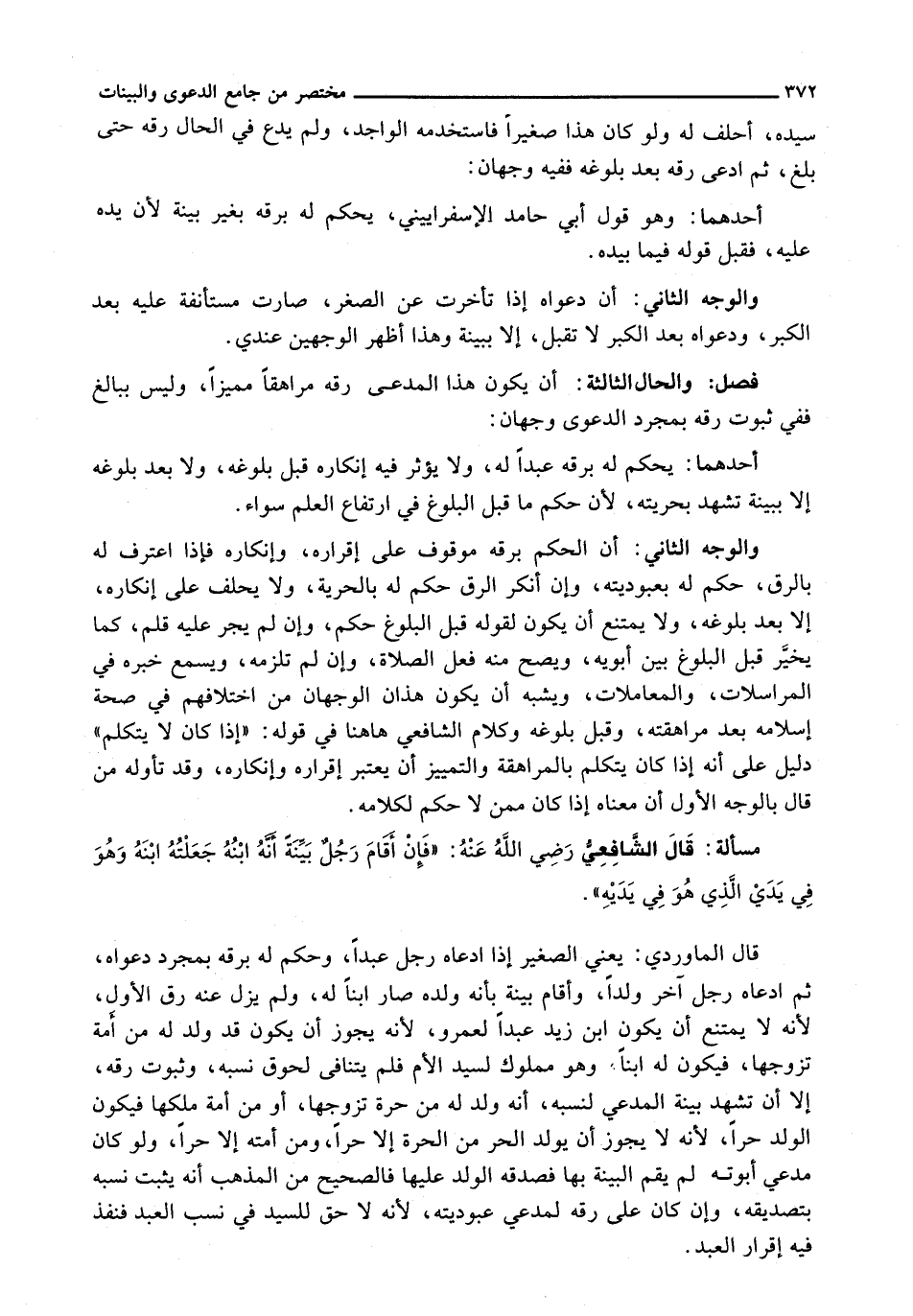 قَالَ الْمَاوَرْدِيُّ: يَعْنِي الصَّغِيرَ إِذَا ادَّعَاهُ رَجُلٌ عَبْدًا، وَحُكِمَ لَهُ بِرِقِّهِ بِمُجَرَّدِ دَعْوَاهُ، ثُمَّ ادَّعَاهُ رَجُلٌ آخَرُ وَلَدًا، وَأَقَامَ بَيِّنَةً بِأَنَّهُ وَلَدُهُ صَارَ ابْنًا لَهُ، وَلَمْ يَزُلْ عَنْهُ رِقٌّ الْأَوَّلِ، لِأَنَّهُ لَا يَمْتَنِعُ أَنْ يَكُونَ ابْنَ زَيْدٍ عَبْدًا لِعَمْرٍو، لِأَنَّهُ يَجُوزُ أَنْ يَكُونَ قَدْ وُلِدَ لَهُ مِنْ أَمَةٍ تَزَوَّجَهَا، فَيَكُونُ لَهُ ابْنًا، وَهُوَ مَمْلُوكٌ لِسَيِّدِ الْأُمِّ فَلَمْ يَتَنَافَى لُحُوقُ نَسَبِهِ، وَثُبُوتُ رِقِّهِ، إِلَّا أَنْ تَشْهَدَ بَيِّنَةُ الْمُدَّعِي لِنَسَبِهِ، أَنَّهُ وُلِدَ لَهُ مِنْ حُرَّةٍ تَزَوَّجَهَا، أَوْ مِنْ أَمَةٍ مَلِكَهَا فَيَكُونُ الْوَلَدُ حُرًّا، لِأَنَّهُ لَا يَجُوزُ أَنْ يُولَدَ الْحُرُّ مِنَ الْحُرَّةِ إِلَّا حُرًّا، وَمِنْ أَمَتِهِ إِلَّا حُرًّا، وَلَوْ كَانَ مُدَّعِي أُبُوَّتِهِ لَمْ يُقِمُ الْبَيِّنَةَ بِهَا فَصَدَّقَهُ الْوَلَدُ عَلَيْهَا فَالصَّحِيحُ مِنَ الْمَذْهَبِ أَنَّهُ يَثْبُتُ نَسَبُهُ بِتَصْدِيقِهِ، وَإِنْ كَانَ عَلَى رِقِّهِ لِمُدَّعِي عُبُودِيَّتِهِ، لِأَنَّهُ لَا حَقَّ لِلسَّيِّدِ فِي نَسَبِ الْعَبْدِ فَنَفَذَ فِيهِ إِقْرَارُ الْعَبْدِ.