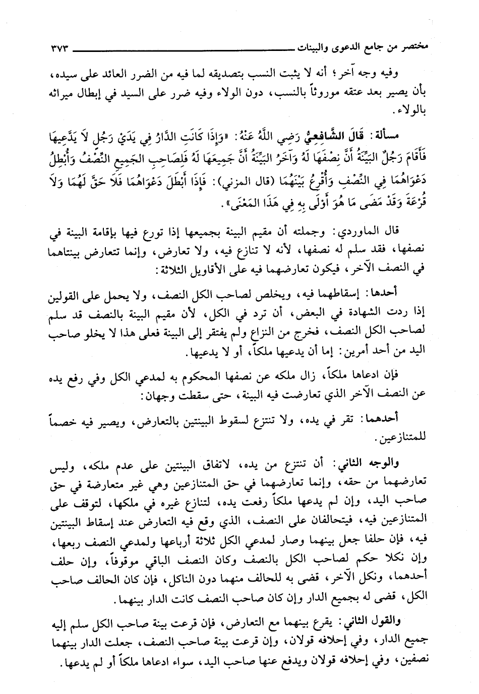 أَحَدُهَا: إِسْقَاطُهُمَا فِيهِ، وَيَخْلُصُ لِصَاحِبِ الْكُلِّ النِّصْفُ، وَلَا يَحْمِلُ عَلَى الْقَوْلَيْنِ إِذَا رُدَّتِ الشَّهَادَةُ فِي الْبَعْضِ، أَنْ تُرَدَّ فِي الْكُلِّ، لِأَنَّ مُقِيمَ الْبَيِّنَةِ بِالنِّصْفِ قَدْ سَلِمَ لِصَاحِبِ الْكُلِّ النِّصْفُ، فَخَرَجَ مِنَ النِّزَاعِ وَلَمْ يَفْتَقِرْ إِلَى الْبَيِّنَةِ فَعَلَى هَذَا لَا يَخْلُو صَاحِبُ الْيَدِ مِنْ أَحَدِ أَمْرَيْنِ: إِمَّا أَنْ يَدَّعِيهَا مِلْكًا، أَوْ لَا يَدَّعِيهَا.