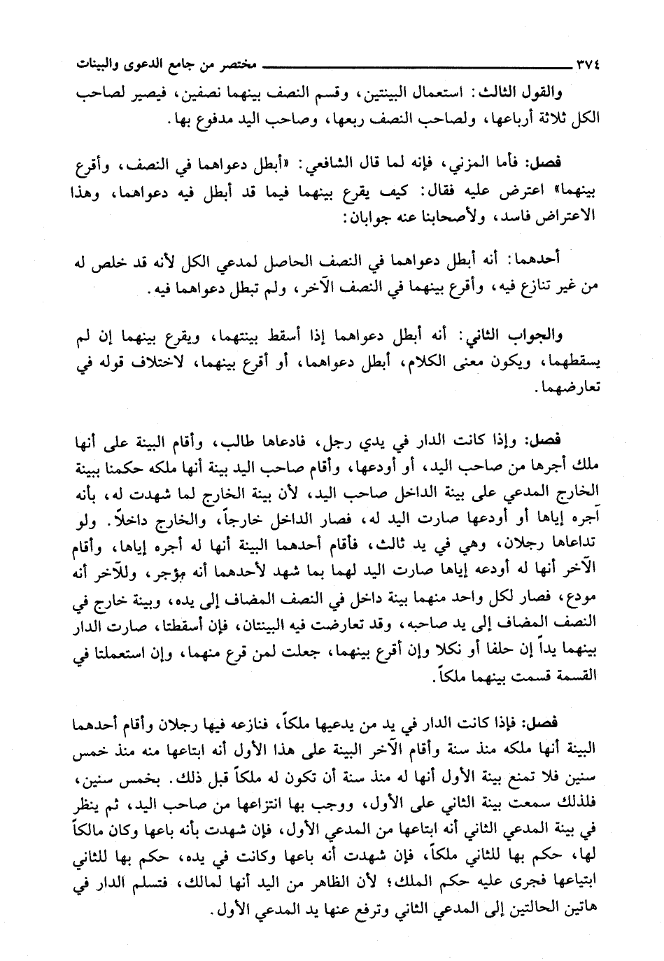 : فَإِذَا كَانَتِ الدَّارُ فِي يَدِ مَنْ يَدَّعِيهَا مِلْكًا، فَنَازَعَهُ فِيهَا رَجُلَانِ وَأَقَامَ أَحَدُهُمَا الْبَيِّنَةَ أَنَّهَا مِلْكُهُ مُنْذُ سَنَةٍ وَأَقَامَ الْآخَرُ الْبَيِّنَةَ عَلَى هَذَا الْأَوَّلِ أَنَّهُ ابْتَاعَهَا مِنْهُ مُنْذُ خَمْسِ سِنِينَ فَلَا تُمْنَعُ بَيِّنَةُ الْأَوَّلِ أَنَّهَا لَهُ مُنْذُ سَنَةٍ أَنْ تَكُونَ لَهُ مِلْكًا قَبْلَ ذَلِكَ. بِخَمْسِ سِنِينَ، فَلِذَلِكَ سُمِعَتْ بَيِّنَةُ الثَّانِي عَلَى الْأَوَّلِ، وَوَجَبَ بِهَا انْتِزَاعُهَا مِنْ صَاحِبِ الْيَدِ، ثُمَّ يُنْظَرُ فِي بَيِّنَةِ الْمُدَّعِي الثَّانِي أَنَّهُ ابْتَاعَهَا مِنَ الْمُدَّعِي الْأَوَّلِ، فَإِنْ شَهِدَتْ بِأَنَّهُ بَاعَهَا وَكَانَ مَالِكًا لَهَا، حُكِمَ بِهَا لِلثَّانِي مِلْكًا، فَإِنْ شَهِدَتْ أَنَّهُ بَاعَهَا وَكَانَتْ فِي يَدِهِ، حُكِمَ بِهَا لِلثَّانِي ابْتِيَاعُهَا فَجَرَى عَلَيْهِ حُكْمُ الْمِلْكِ؛ لِأَنَّ الظَّاهِرَ مِنَ الْيَدِ أَنَّهَا لِمَالِكٍ، فَتُسَلَّمُ الدَّارُ فِي هَاتَيْنِ الْحَالَتَيْنِ إِلَى الْمُدَّعِي الثَّانِي وَتُرْفَعُ عَنْهَا يَدُ الْمُدَّعِي الْأَوَّلِ.